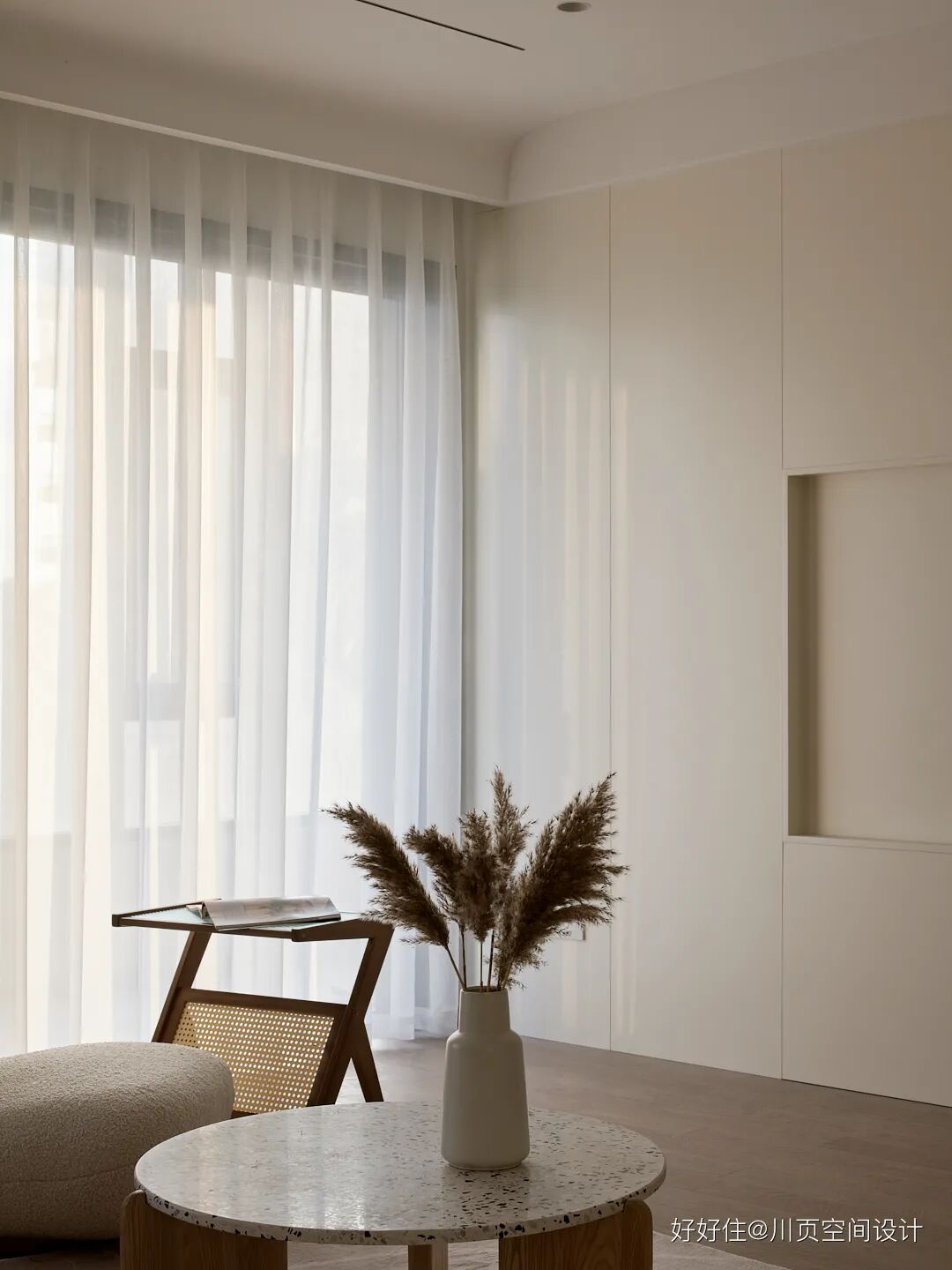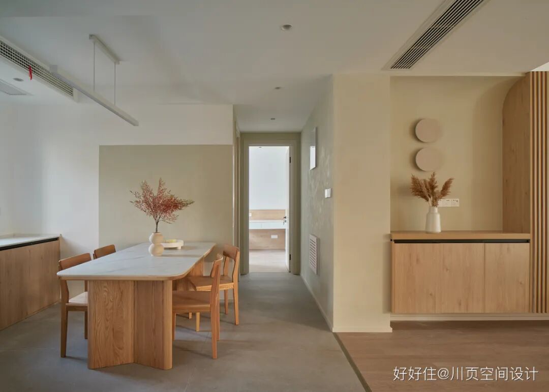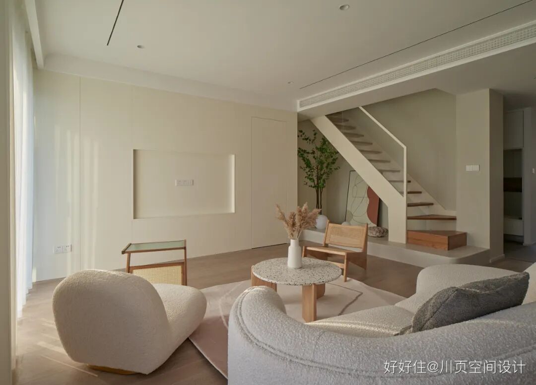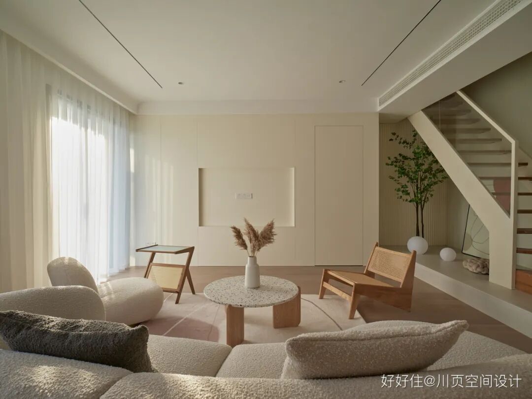 川页空间设计:客厅采用无主灯设计,在材质上选用了艺术漆和原木材质,营造清新静谧的家居氛围。
