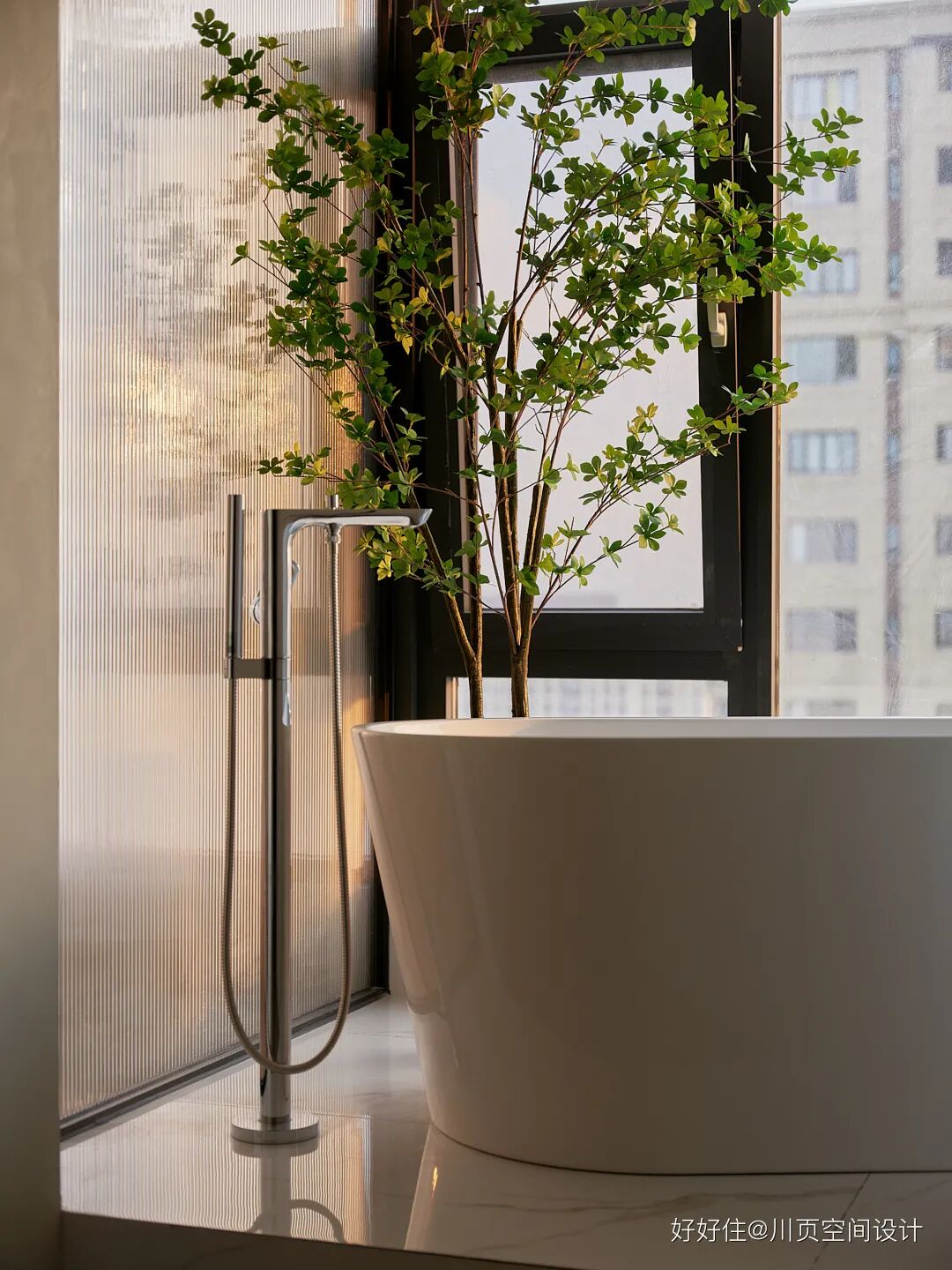 川页空间设计:考虑到男女主人对淋浴方式的不能需求,将二楼阳台处设置了浴缸,同时解决了男女主人的追求。