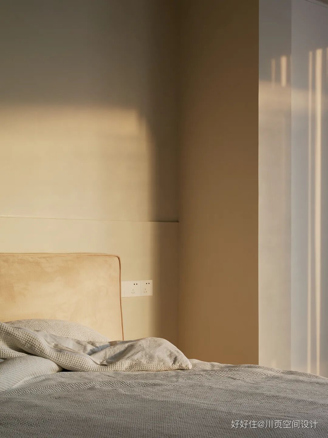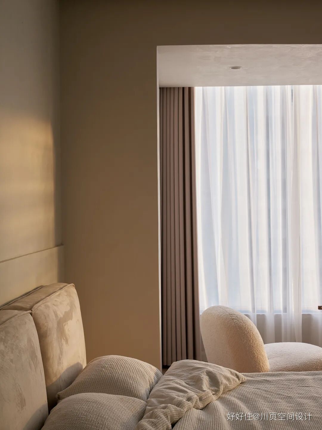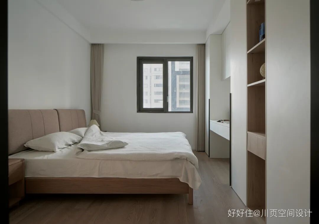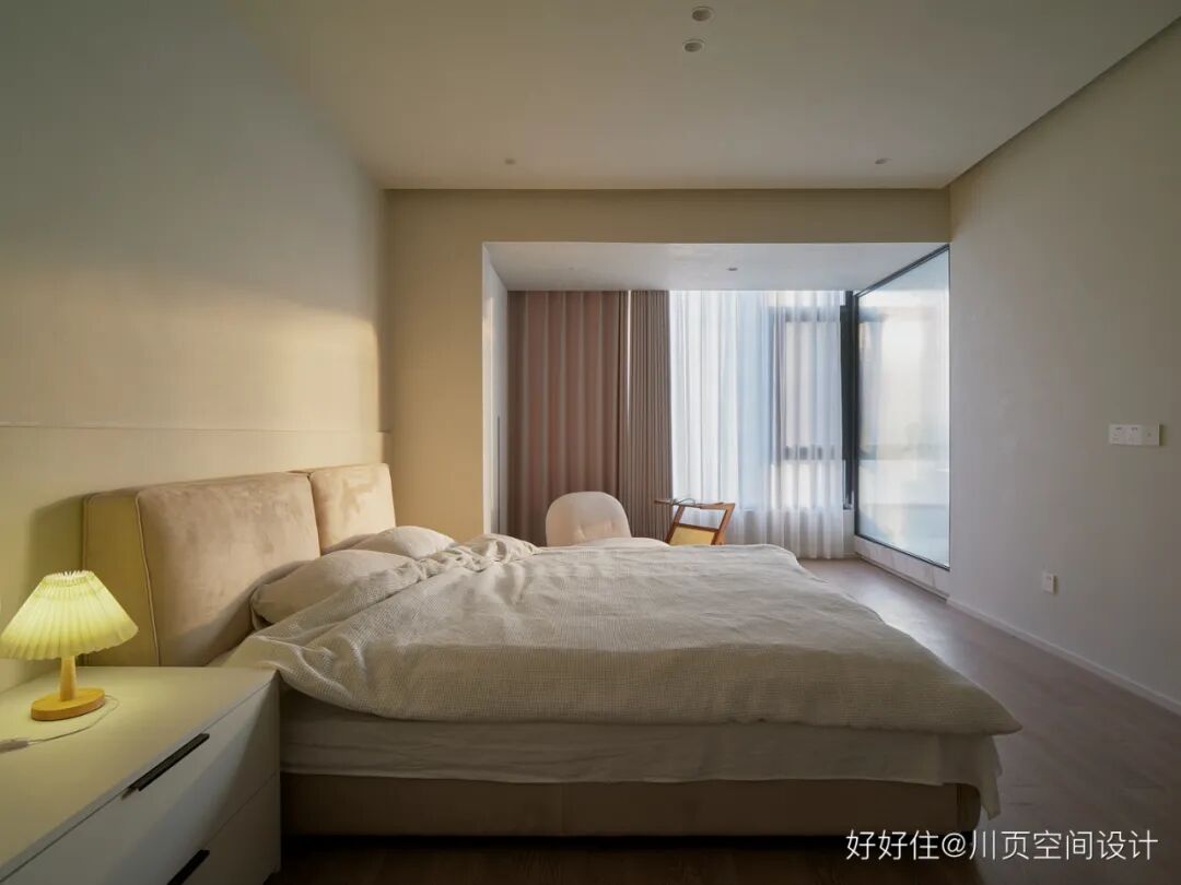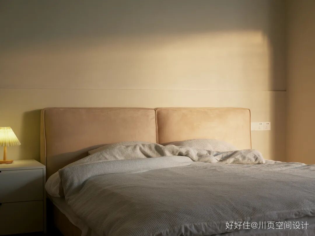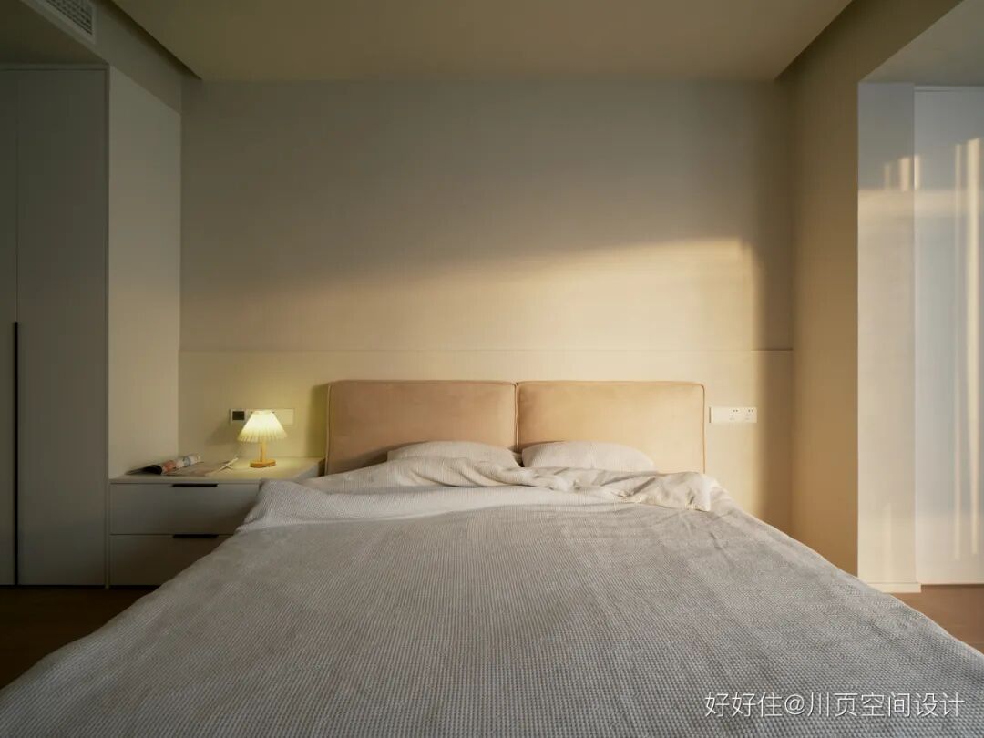 川页空间设计:主卧采用了奶油色的艺术漆+白色柜子,整个空间的色调实现了和谐统一。阳光成了主卧最独特的装饰元素,无论是沐浴在阳光中睡懒觉,还是在阳台看书、喝咖啡,都惬意十足!