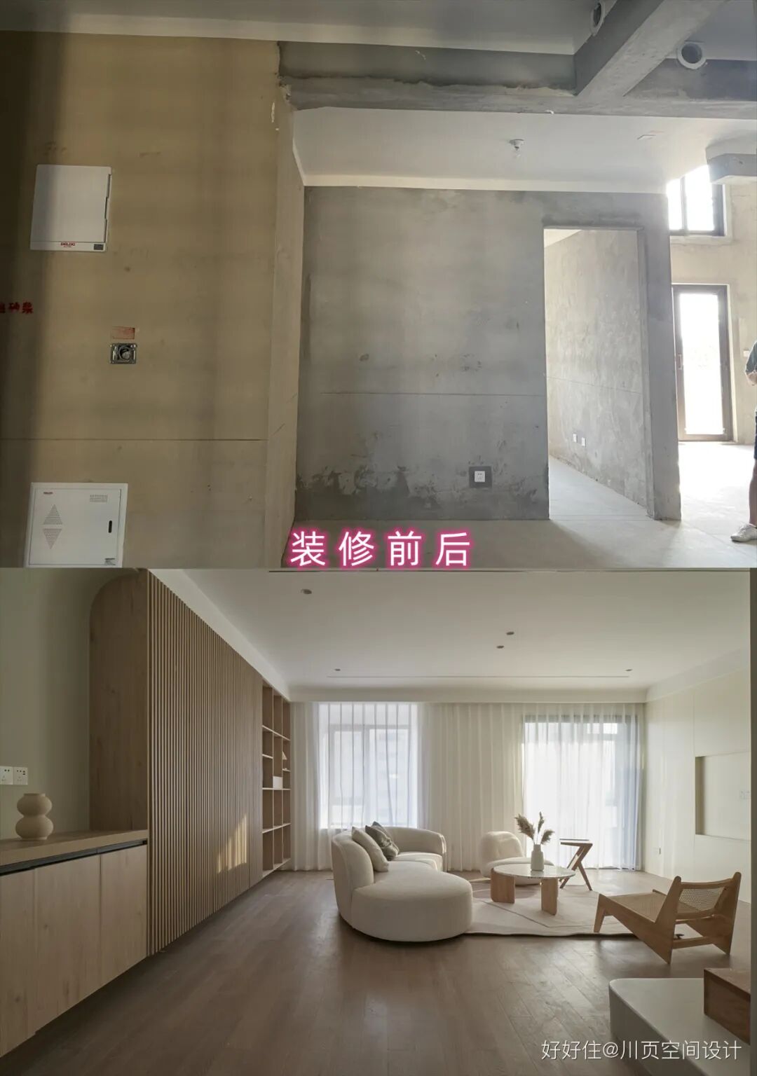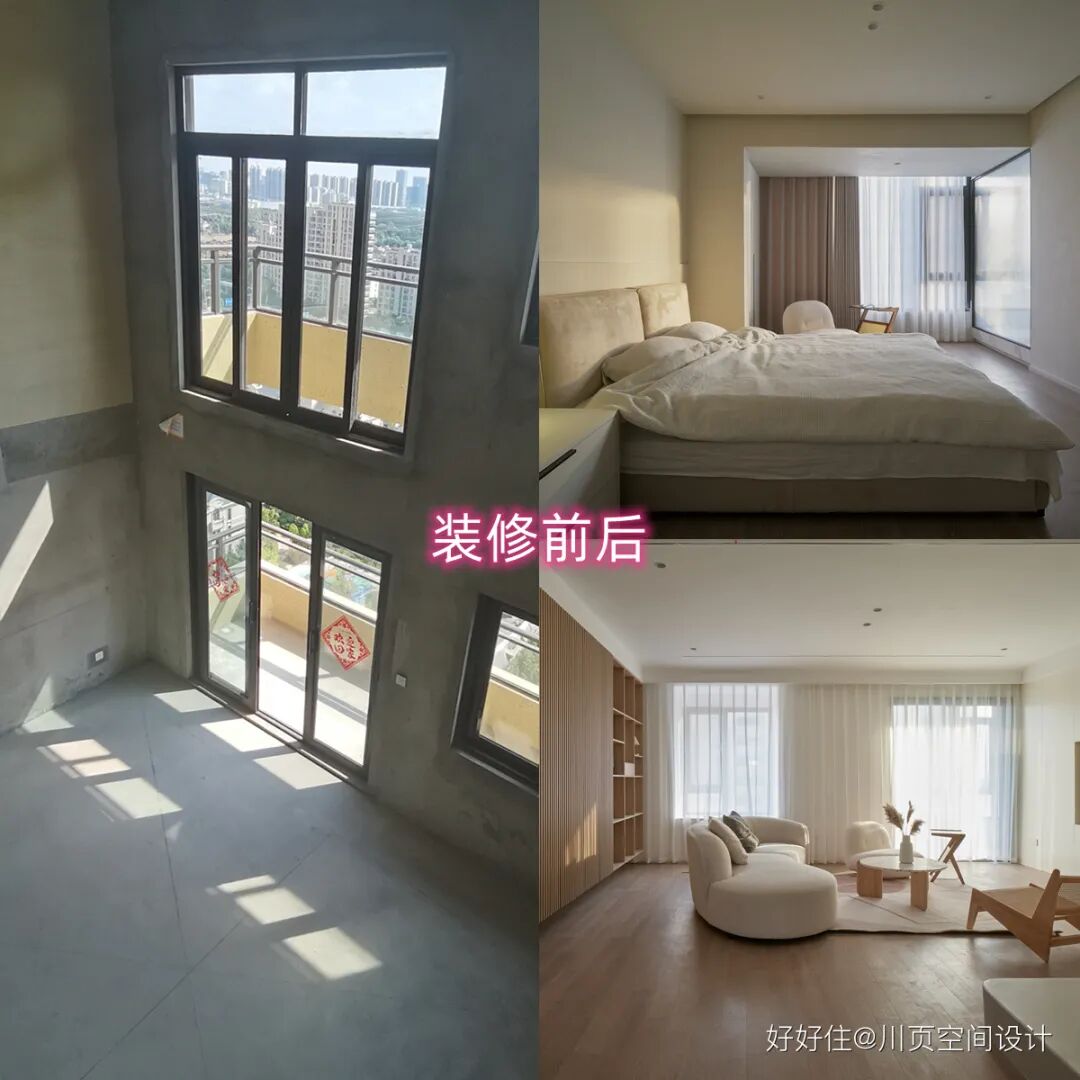 川页空间设计:客厅挑高区域装修前后对比图,挑高区域浇筑成了二楼主卧套间。
