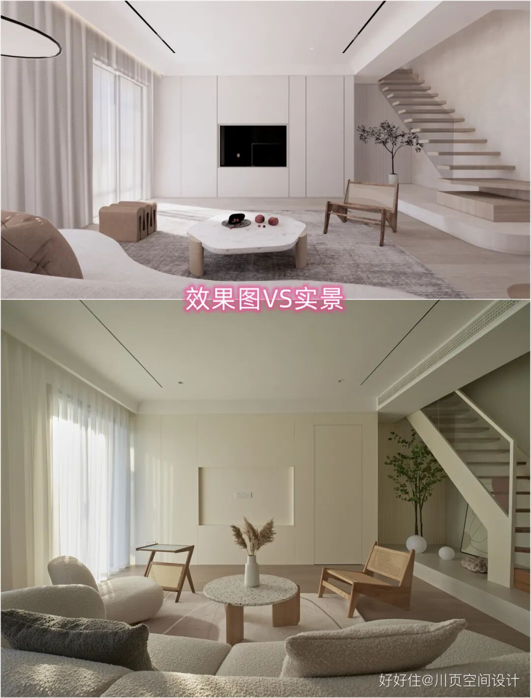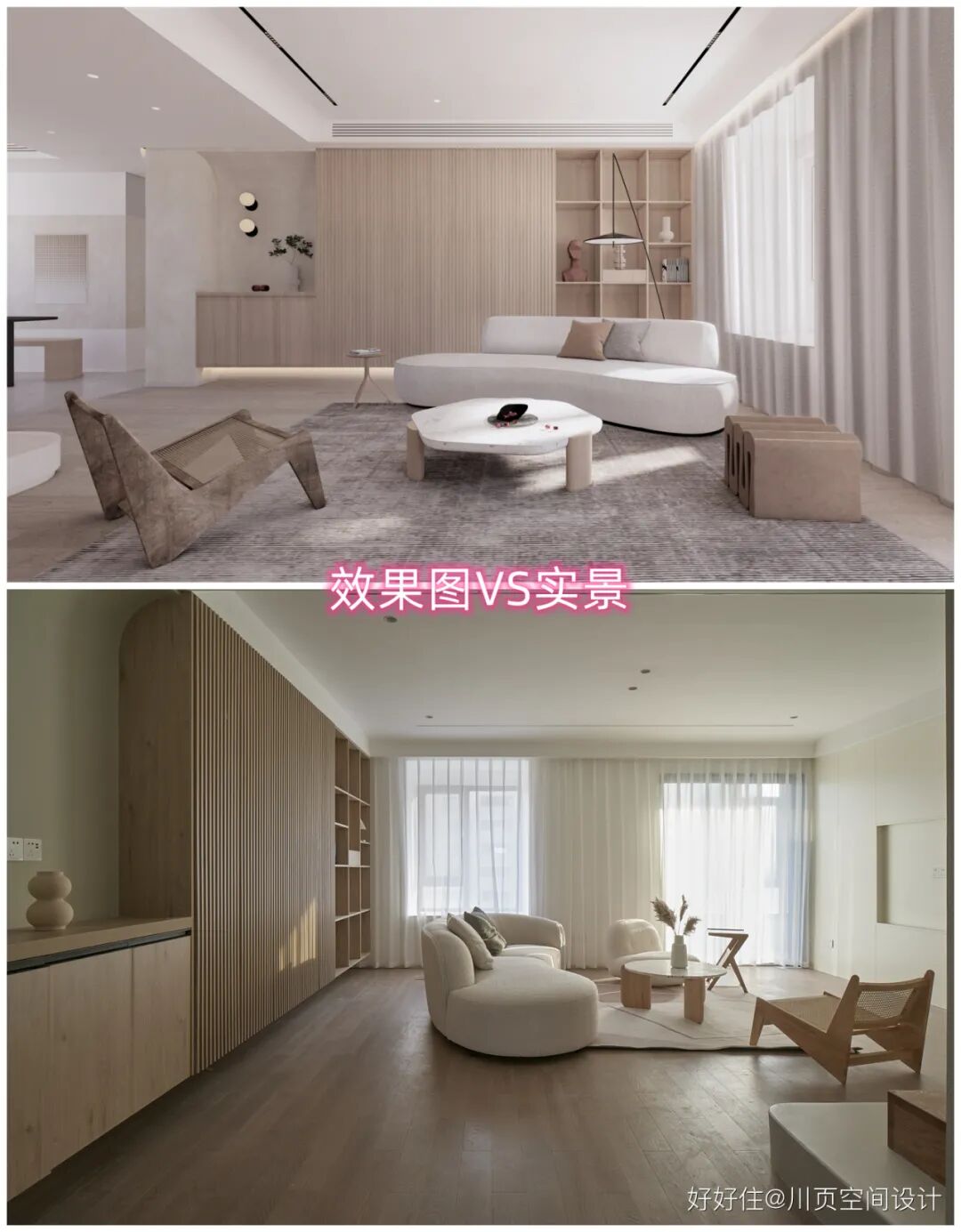 川页空间设计:客厅装修效果图与实景图对比。