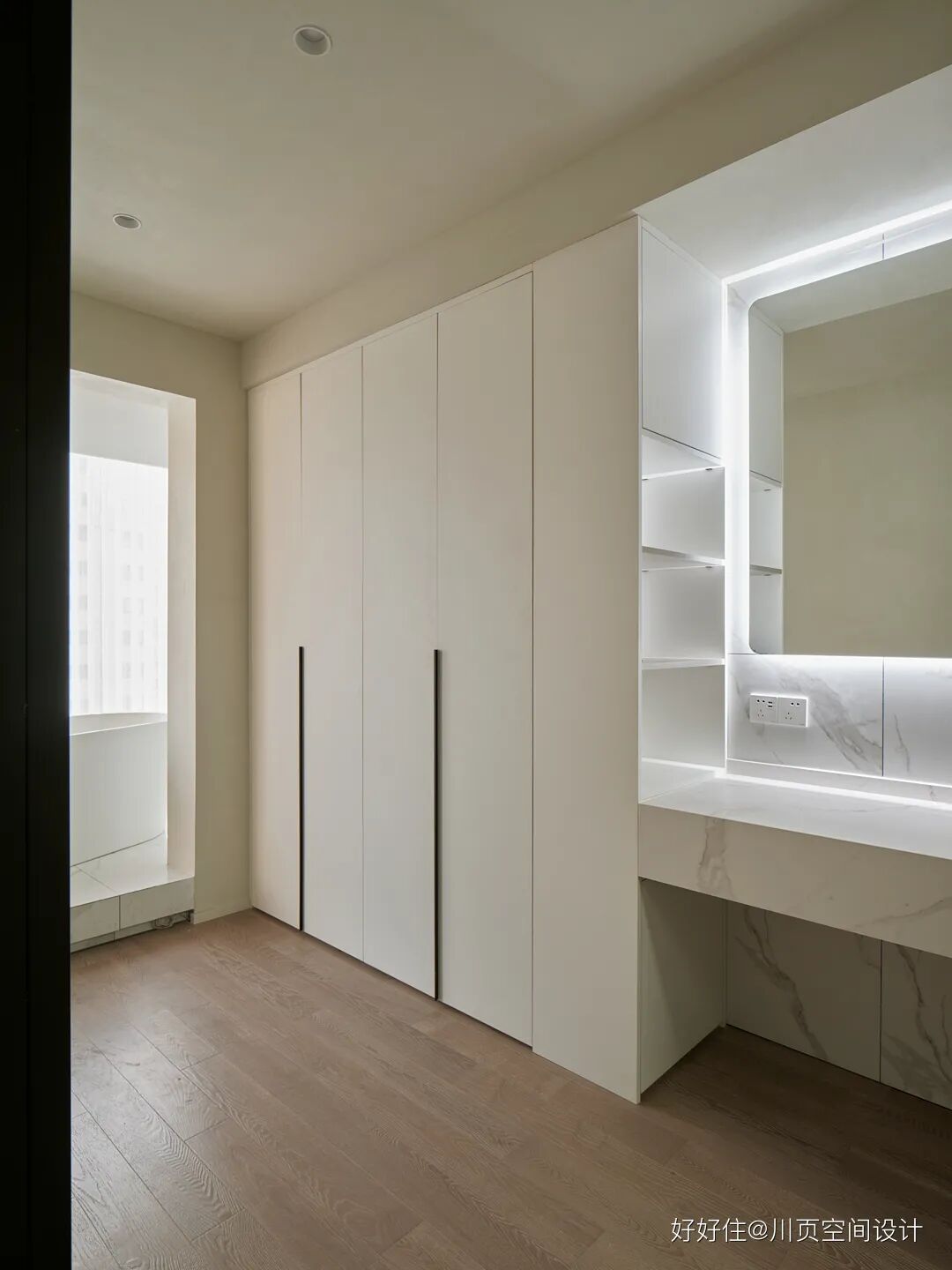 川页空间设计:这里既是卫生间,也是衣帽间,同时也是书房、化妆间,实现了一屋多用。