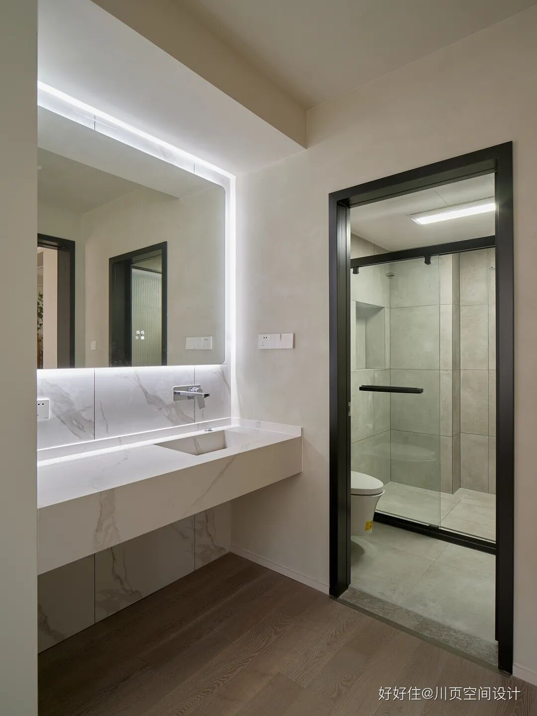 川页空间设计:这里既是洗漱台也是化妆台,因此洗手台采用了墙排,让整个空间显得更宽敞。
