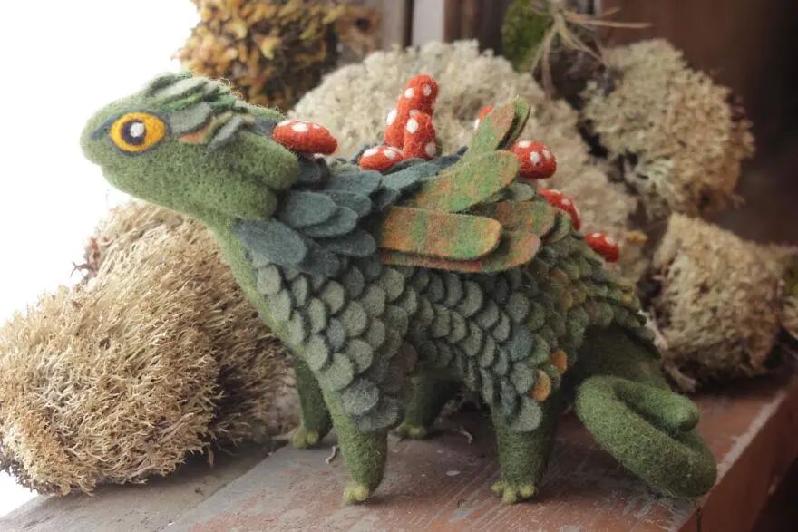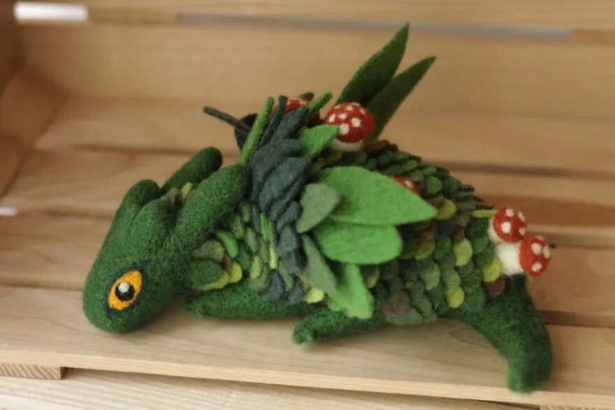 阿莱娜·博布罗娃的毛毡小龙总是能带给人很多的惊喜,让人产生无限的想象,因为,艺术家在创作中增加了一些来自大自然的元素,比如背上长出蘑菇的小龙、长得神似一只菠萝的小龙等等。可爱极了,很多人看完她的作品后,都表示被这些毛毡龙萌化了。