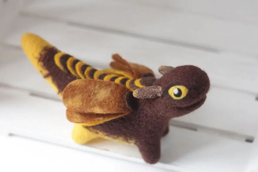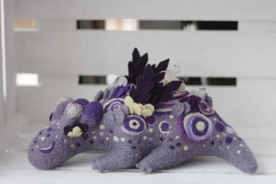 所以说,对龙的迷恋,不只有我们。来自俄罗斯的一位羊毛毡艺术家阿莱娜·博布罗娃,也是一位“龙的粉丝”,她喜欢用毛毡制作各种各样的野兽,尤其是传说中的西方巨龙。这位艺术家受野生自然的启发,以羊毛、天然宝石、贝壳为材料,再加上自己的无限创意,创作了众多栩栩如生的毛毡龙。