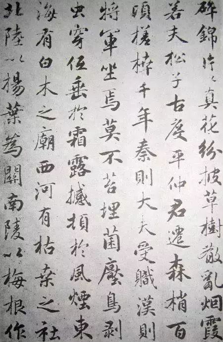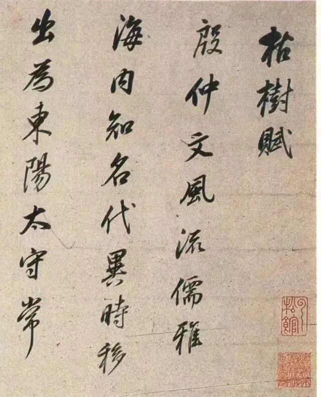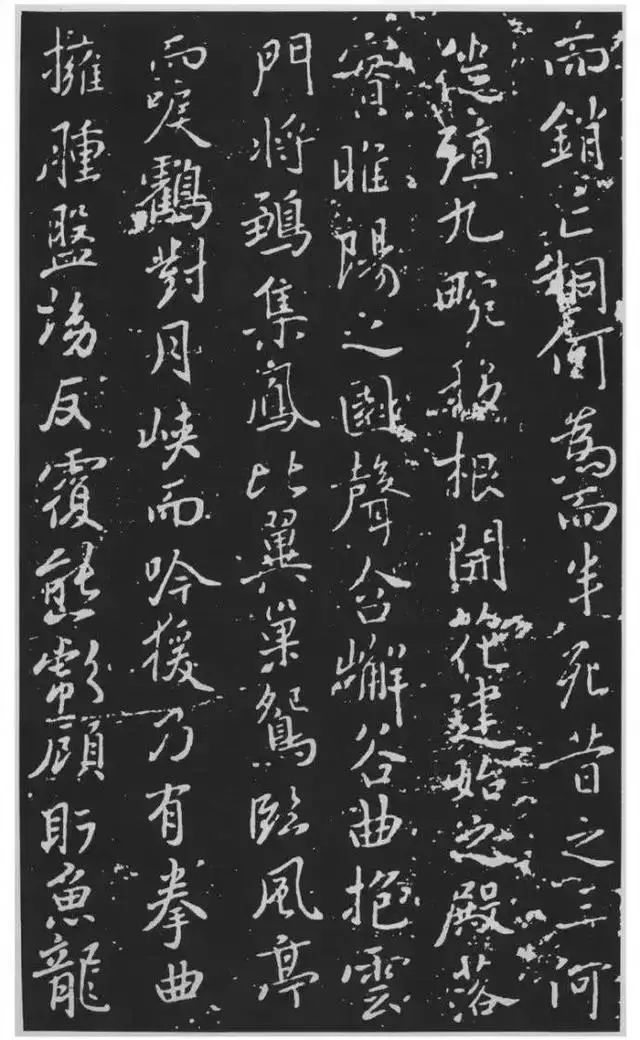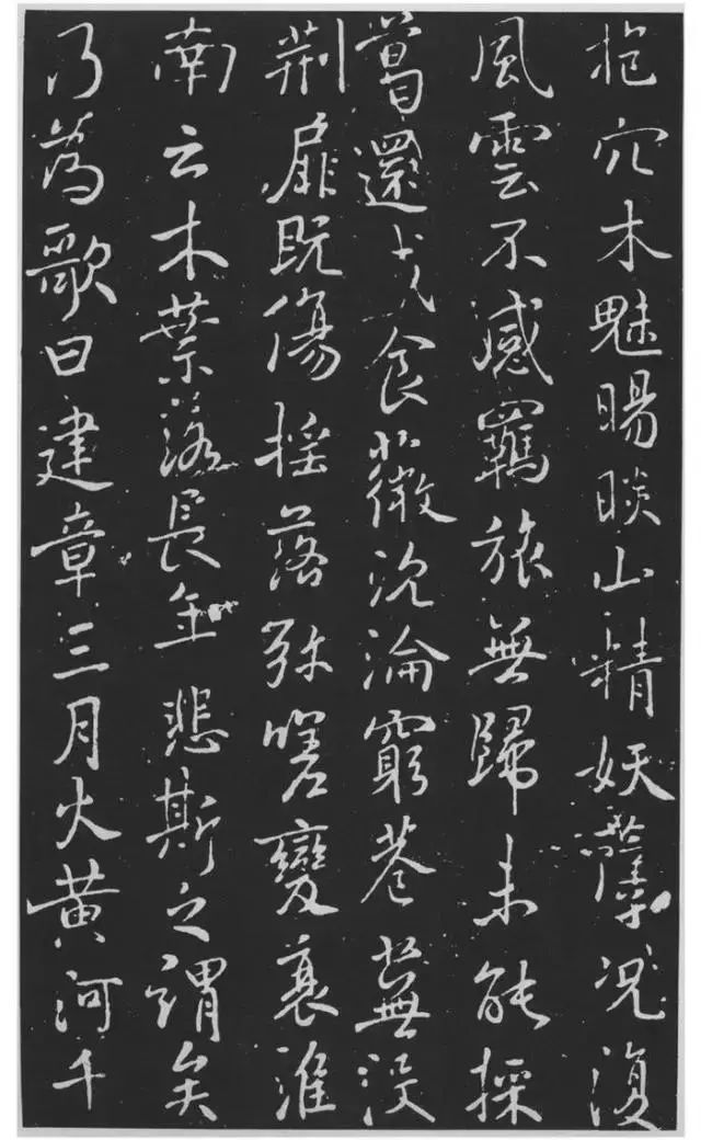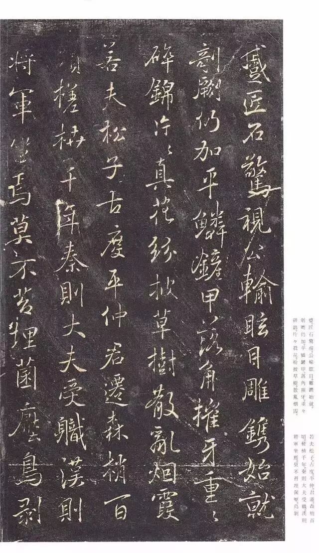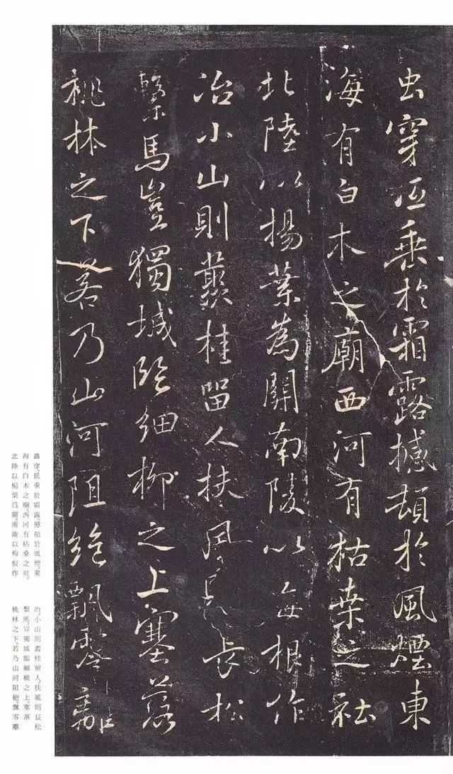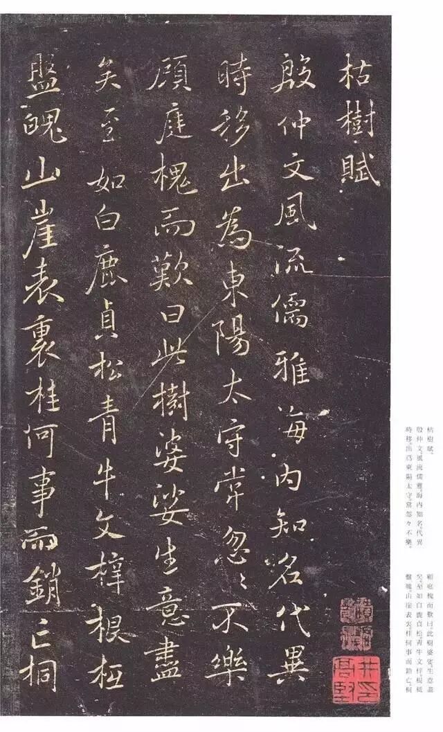 褚遂良《枯树赋》,仅有刻本传世。款题贞观四年书。共三十九行,计四百六十七字。书势倚正纵横,错综变化, 明王世贞评称:“ 掩映斐叠, 极有好致, …… 有美女婵娟, 不胜罗绮之态。”《 听雨楼帖》、《玉烟堂帖》、《 戏鸿堂帖》、《 邻苏园帖 》等均收入, 而以《听雨楼帖》所刻为精。又,元代赵孟頫有墨迹临本传世。明代周天球称:“整密秀润, 不少露北海姿态,亦尽气为褚敌者。”见《支那南画大成.题跋集》。