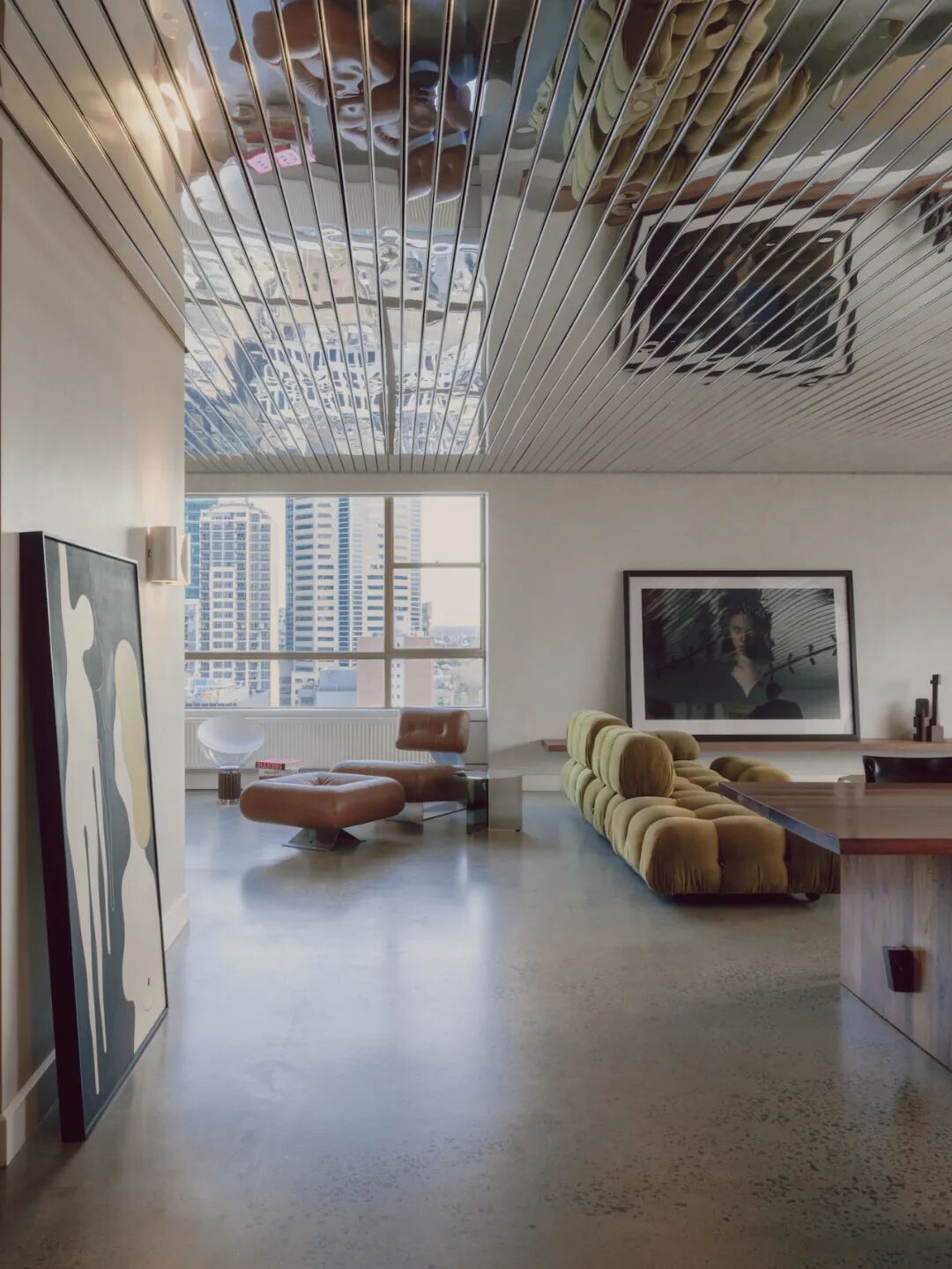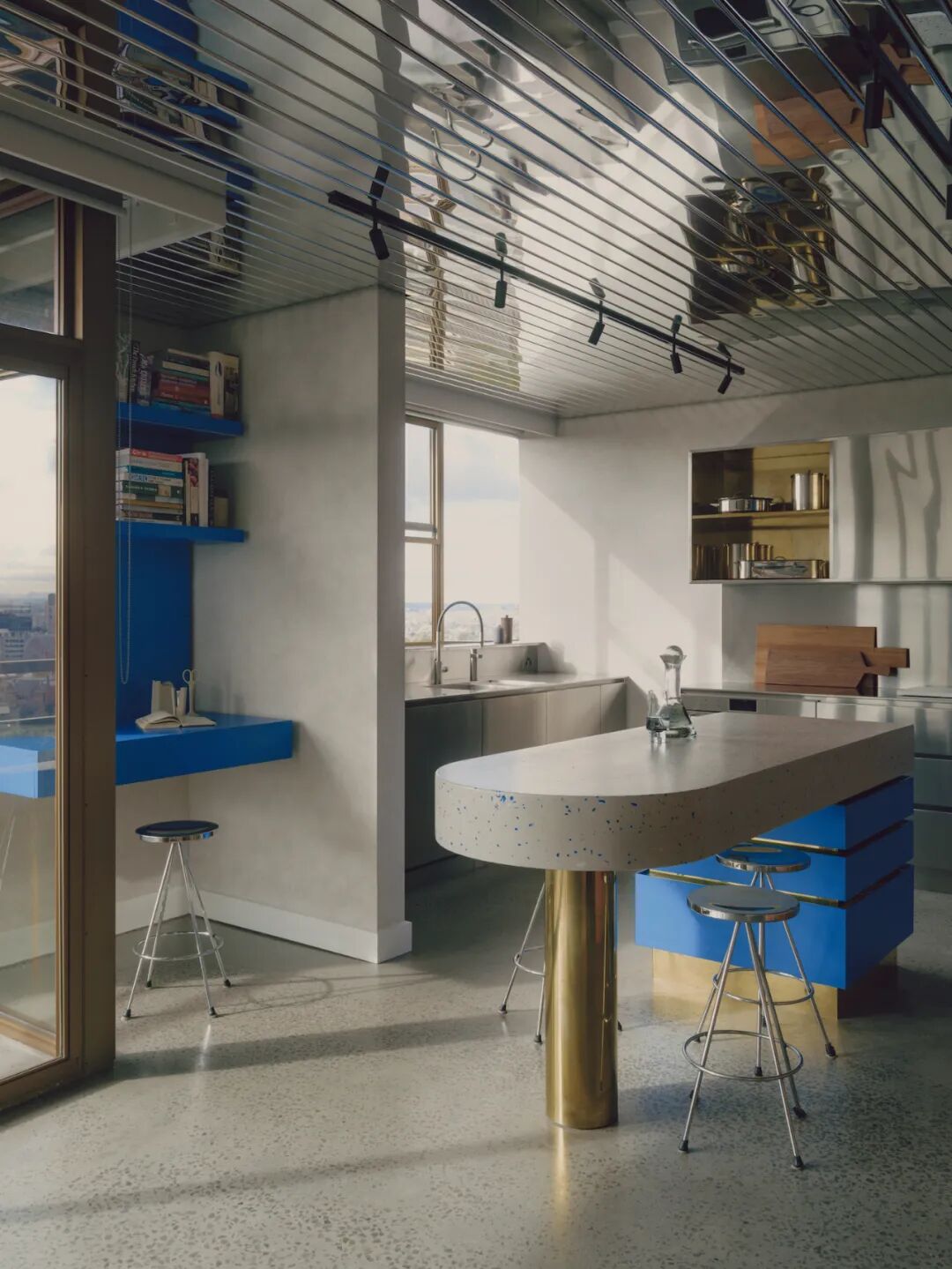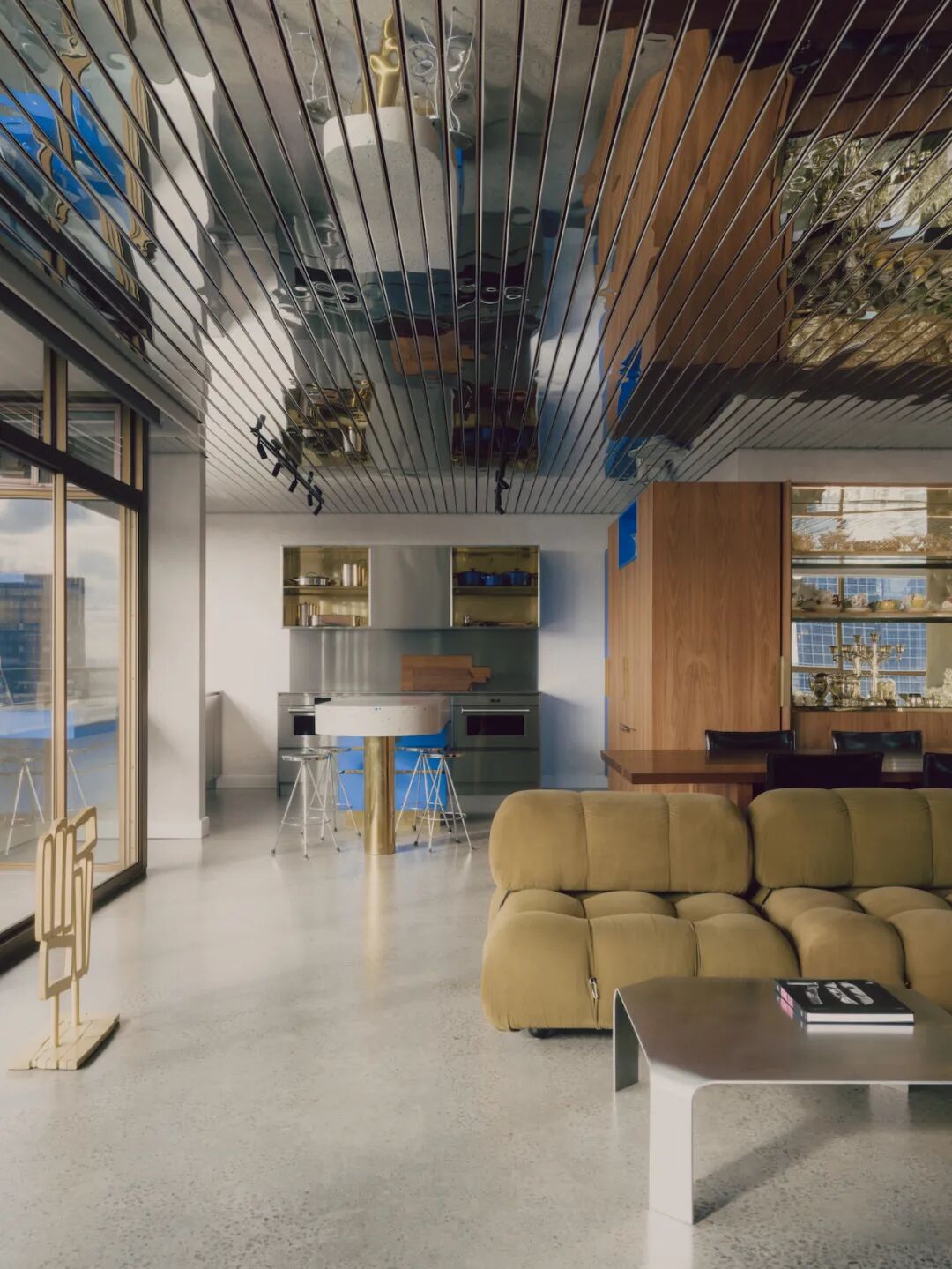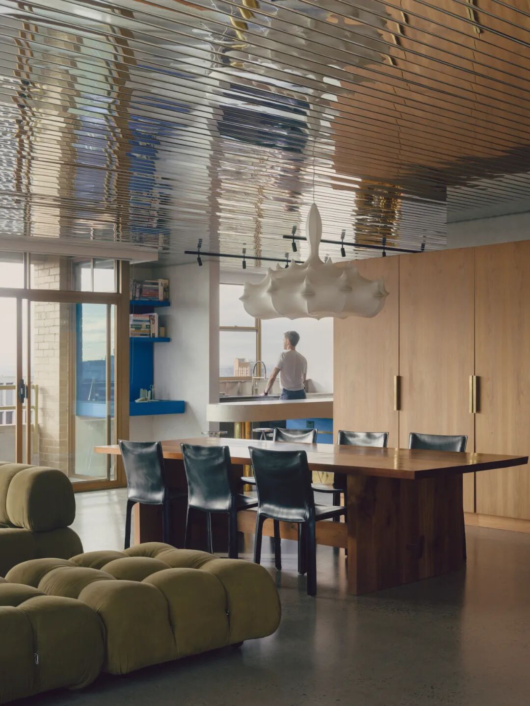 Walking into the apartment, the first thing you notice is the silver ceiling, which effectively doubles all the spatial content of the apartment. The designer likens the material palette to famous Brutalist buildings such as London's Barbican. "The key to balancing the harsh exterior was creating a warm textured interior," he said. The heavy wood reflected in the dining table and joinery is offset by the brilliant blue paint color.