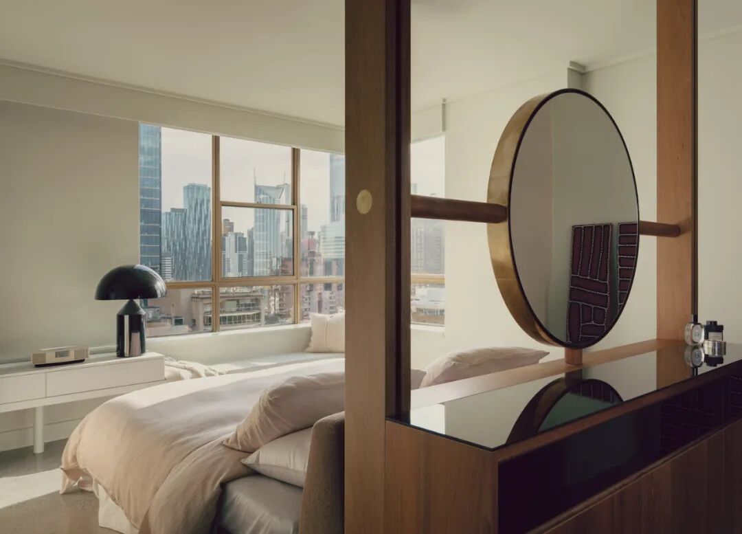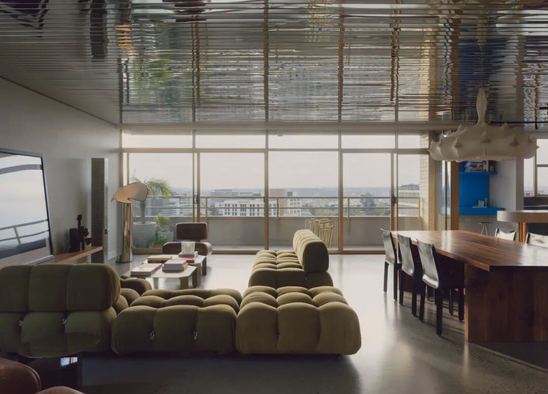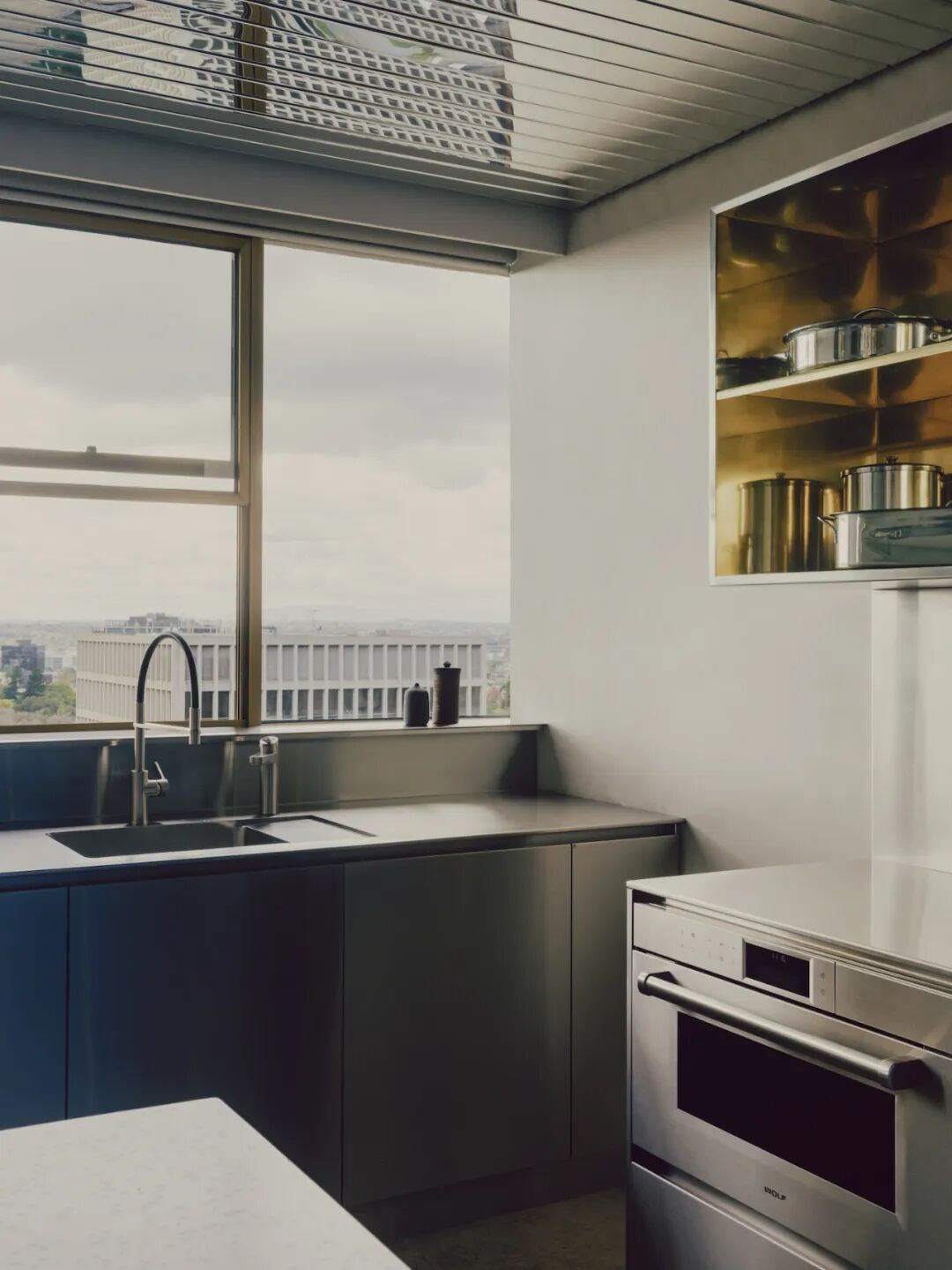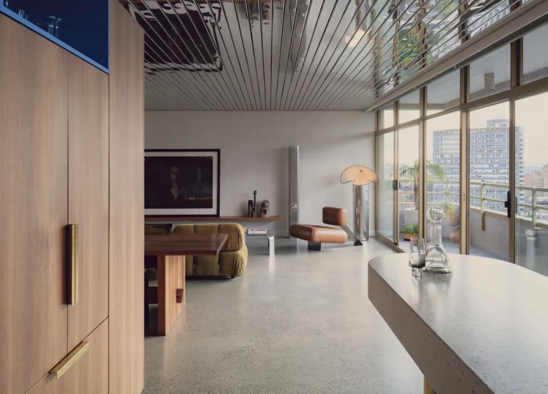 Walking into the apartment, the first thing you notice is the silver ceiling, which effectively doubles all the spatial content of the apartment. The designer likens the material palette to famous Brutalist buildings such as London's Barbican. "The key to balancing the harsh exterior was creating a warm textured interior," he said. The heavy wood reflected in the dining table and joinery is offset by the brilliant blue paint color.