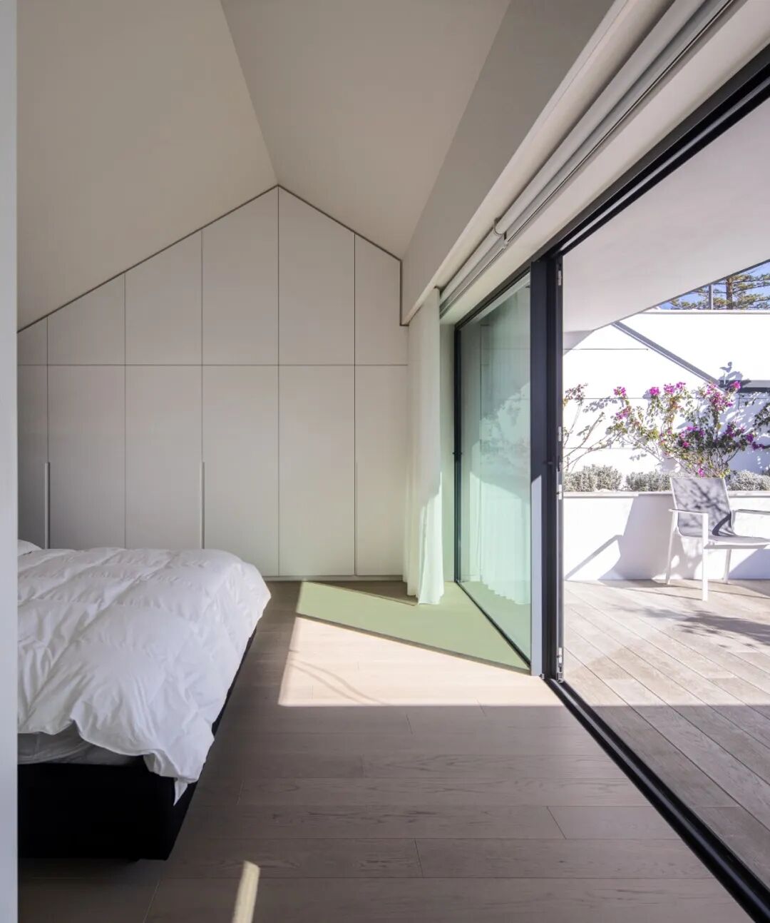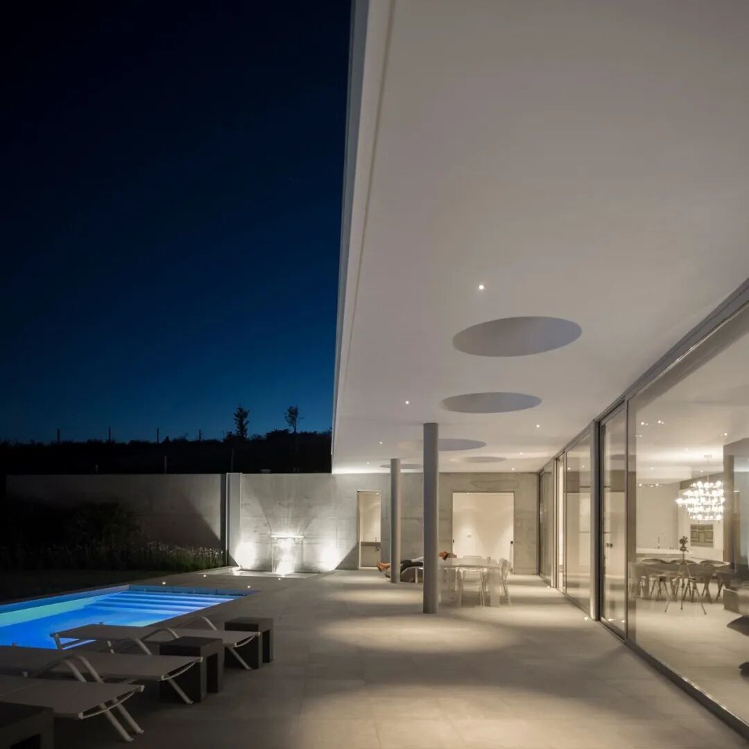 这所房子纯粹是一个白色的水平结构。它的透明度来自于长而连续的玻璃区域,免受阳光的影响,有一个宽敞的,令人惊叹的阴影,朝南的露台。
