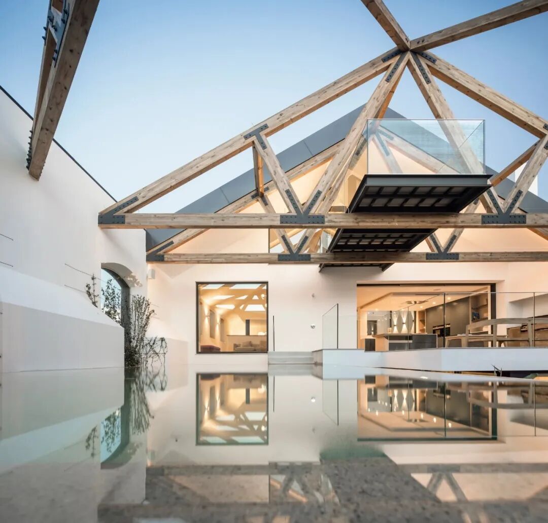 建筑的内部在角落旁边被掏空,用作花园露台和一个凸起的游泳池。屋顶的瓦片只在建筑的这一部分被拆除,但桁架被保留下来,自由地在户外,就像原始空间的顶点,在无限天空的背景下,以一种深刻的亲密关系吸引眼球。