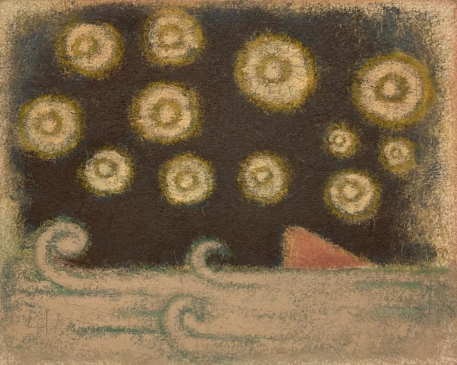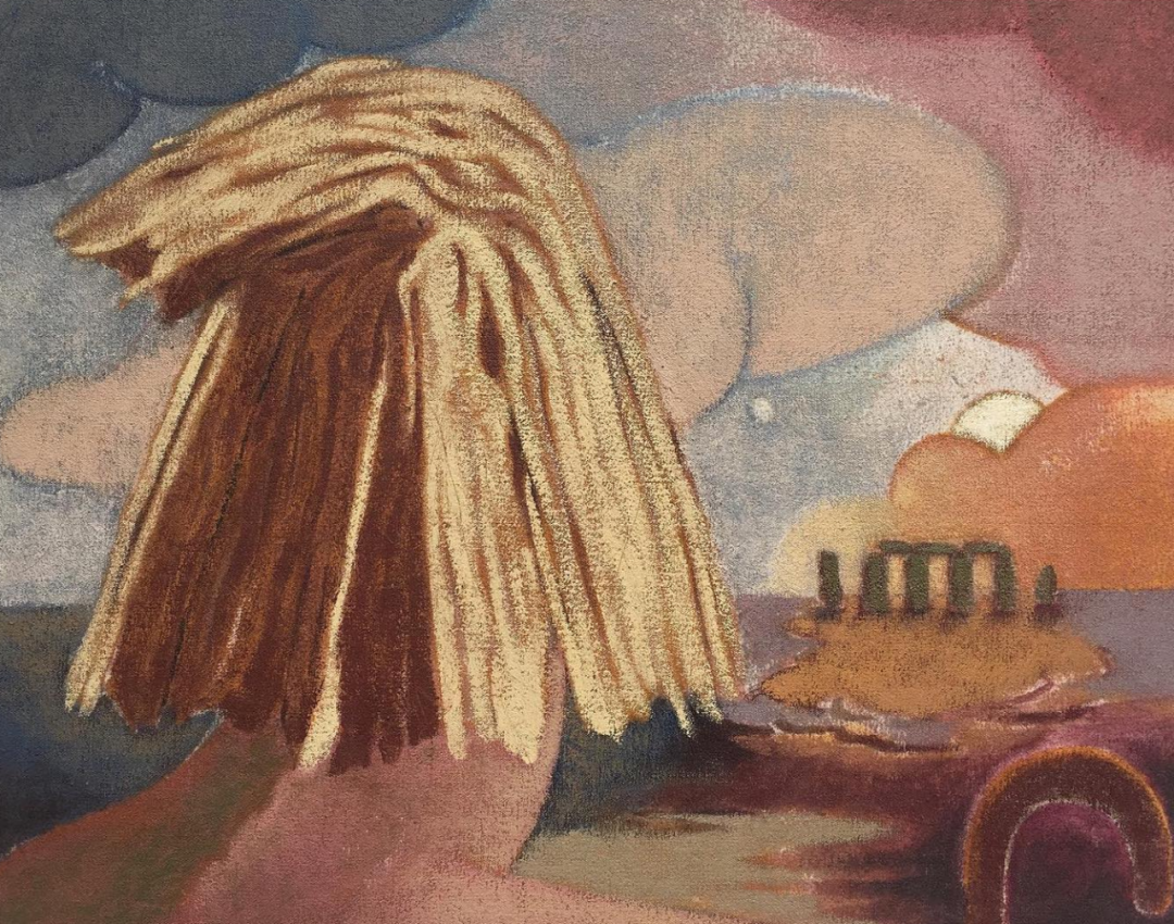 中世纪壁画、古老的英国教堂、Forest Bess、Cecil Collins 和 William Blake 的作品,以及科幻小说书籍都是艺术家的灵感来源。无数的灵感潜意识地进入作品。反复出现的主题出现了——翻滚的云层、翻滚的瀑布、超大的手指和明亮的太阳创造了一个身临其境的世界。生物形态的风景诉说着神话,但在 Cross 的画作中,叙事是故意模棱两可的。熟悉与神秘、安静与史诗、规模与不规则的比例让观者迷惑不解。问题仍未得到解答,意义对艺术家本人来说仍然是个谜。