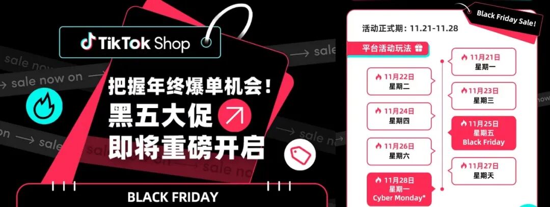 作为欧美国家最大的消费浪潮之一,黑五大促即将拉开帷幕。本次TikTok Shop将联动英国、马来西亚、新加坡、菲律宾四国大促资源,加码营销玩法、多重流量补贴扶持,全链路打造强营销生意场景,助推跨境商家生意爆发。黑五大促活动正式期将由11月21日持续至11月28日,设有重点直播间、直播间打榜赛、短视频挑战赛等玩法。此外,根据不同营销需求,黑五期间将设立各类专项行业热门话题以增加曝光。(信息来源:TikTok Shop 跨境电商)