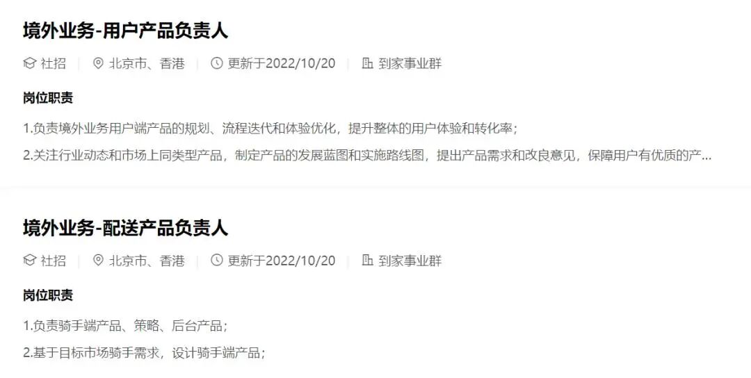10月25日,美团官方招聘平台显示,当日正在招聘中的境外业务相关岗位共计23个,其中20个都在base地一栏里标注了香港,并在招聘要求中注明“粤语及英语可以作为工作语言者优先”。除2个税务相关岗位归属于集团财务平台,其余18个业务岗位都归属于到家事业群,即外卖业务所在事业群。(信息来源:澎湃新闻)