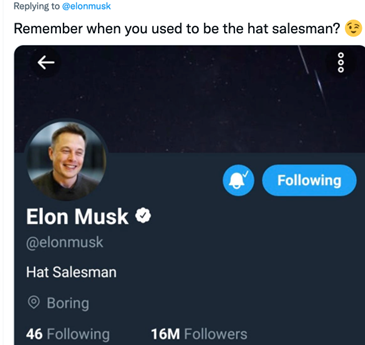 看到马斯克如今将推特简介改成“香水推销员”,有网友在评论区贴出一张图,问:“还记得你曾把简介改成‘帽子推销员’吗?”
