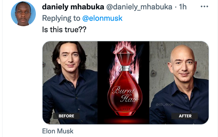 还有腹黑观众不忘记黑一把马斯克的老对头——英年脱发的亚马逊创始人杰克·贝索斯,图中中间是“头发焦了”香水的红色瓶子,左边是长发飘飘的“使用之前”,右边是贝索斯的头顶光溜溜的原照片。