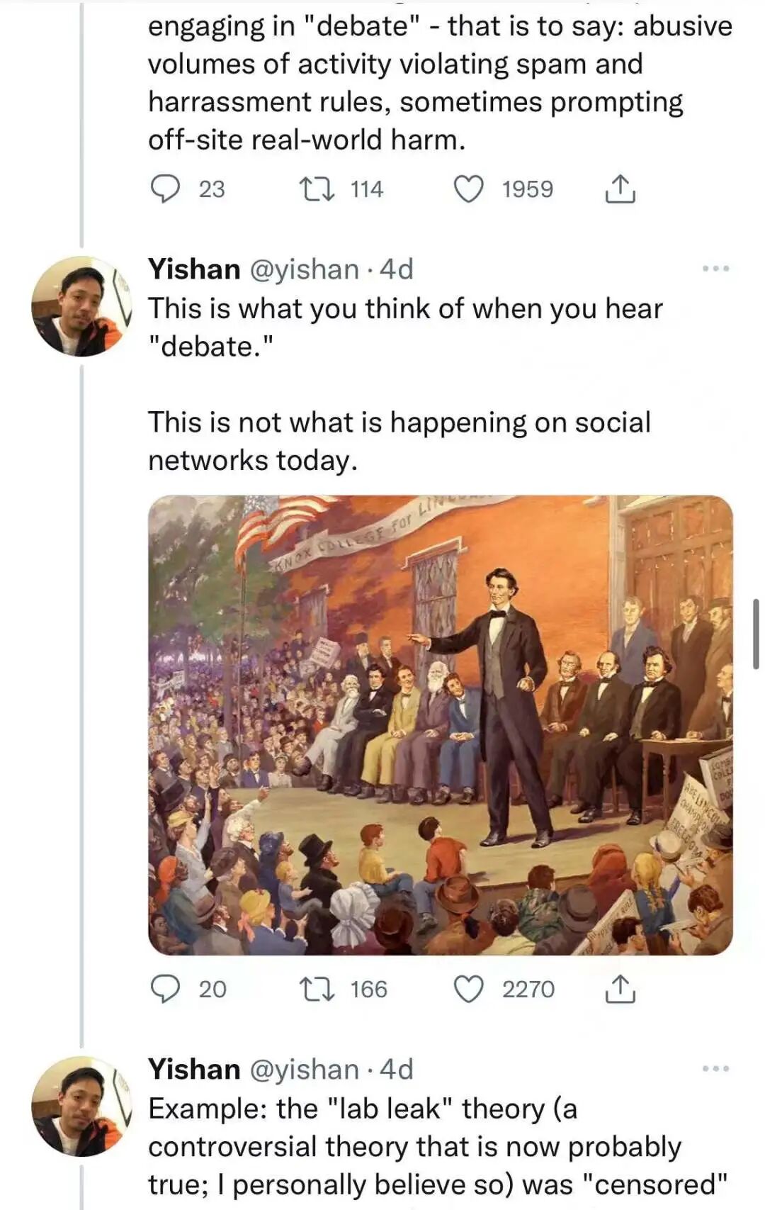 我觉得,对待非主流的想法,最佳解决方式不是审查它们,而是允许讨论更好的想法。但运营一个大型社交网络往往会迫使你背道而驰。