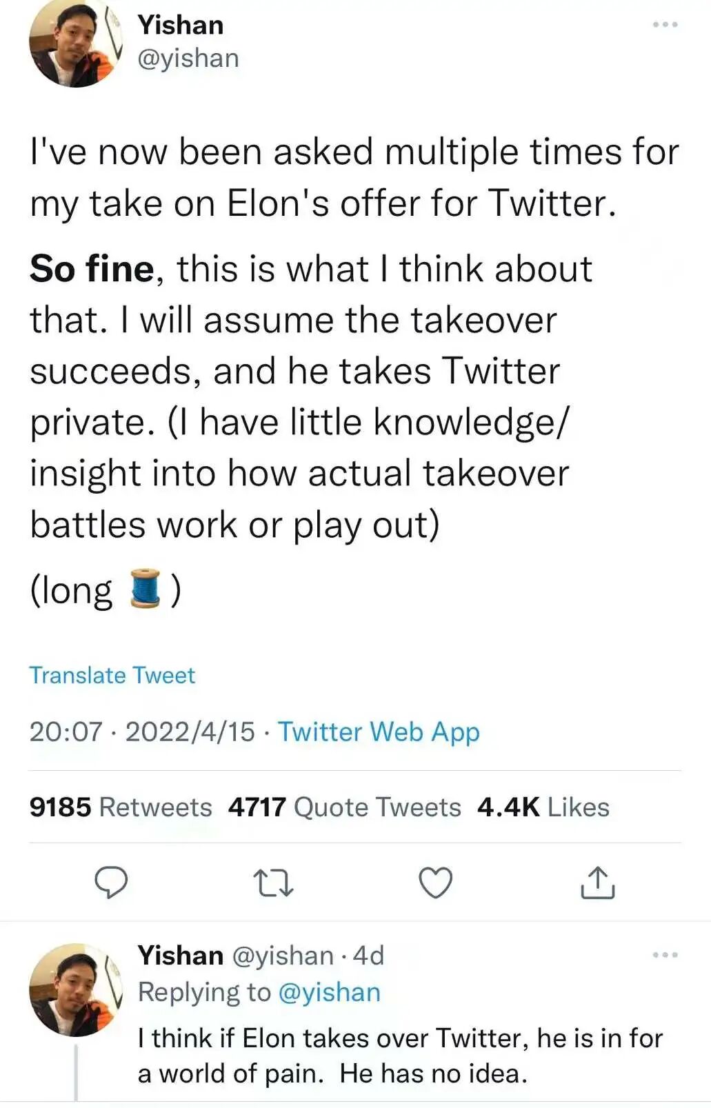 总之,这不是一份有趣的工作。马斯克接管推特,不仅不会解决问题,还会分散他在Space X和特斯拉上的时间和注意力,也会损害他的心理健康,这将是全人类的损失。我不认为马斯克应该这么做,他的时间是宝贵和有限的。