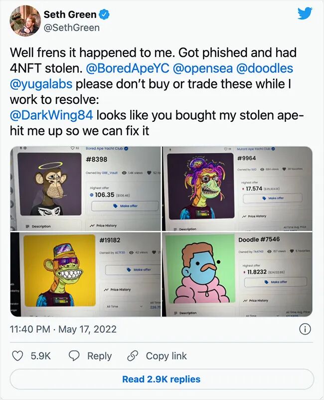 演员 Seth Green 支付了 165 ETH(约为 297000 美元)来追回他的无聊猿 NFT,该 NFT 之前在网络钓鱼攻击中被盗。