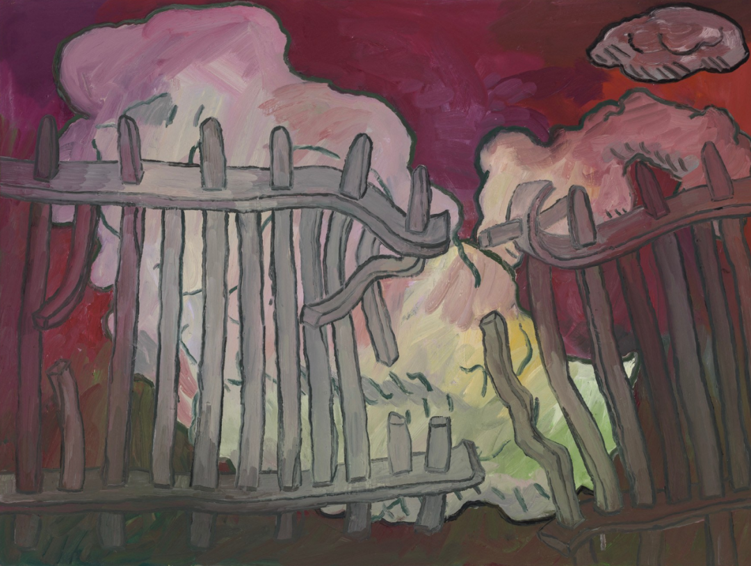 十一个树桩、破损的篱笆和夜晚的粉红色云彩