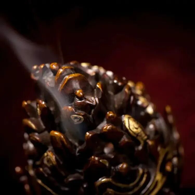 太湖奇石,自然天成,世人以瘦皱漏透为风。今番入炉,取其雄壮沉实之姿,塑嶙峋之态,精铸涡沟环洞,形若玲珑奇石,实似伏虎团云。燃香于内,轻烟飘渺萦绕石状炉体,沉烟下落,若烟瀑顺莲瓣徐徐荡落。