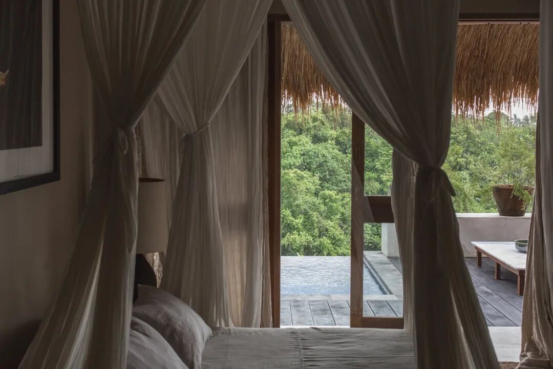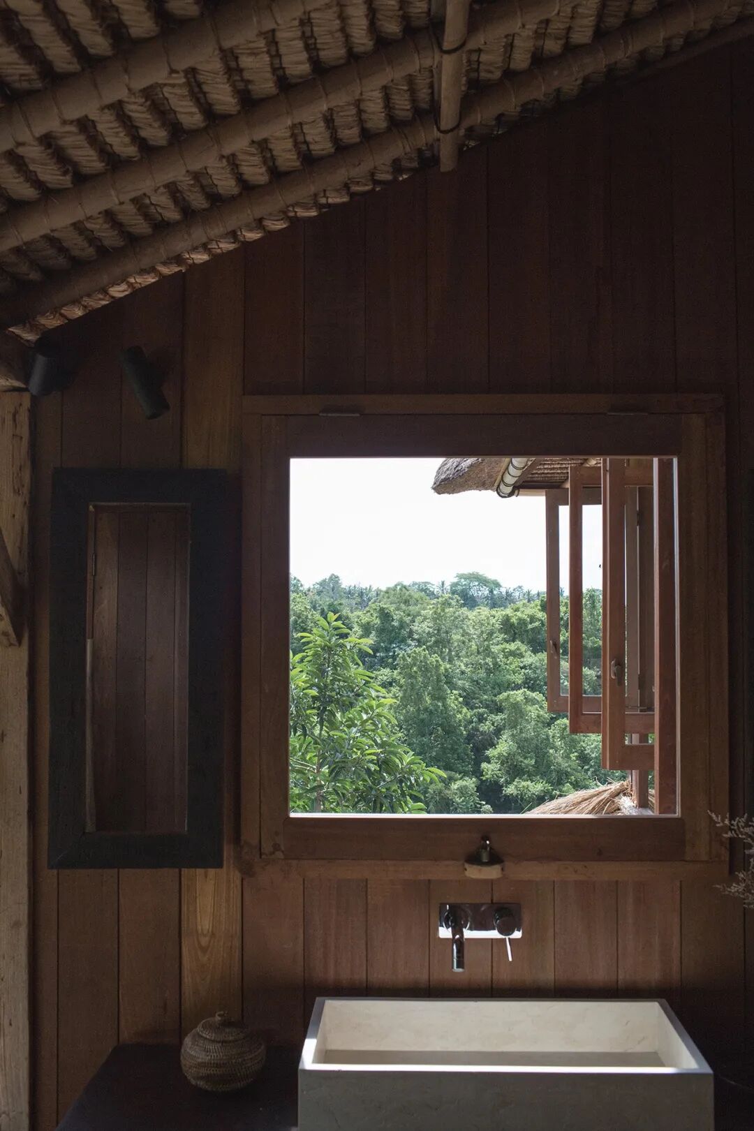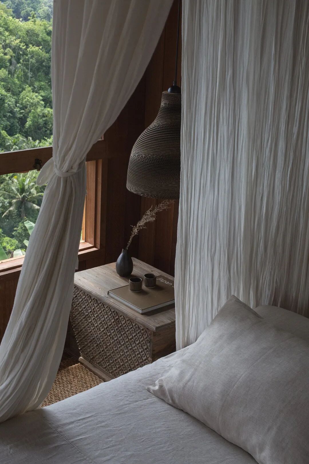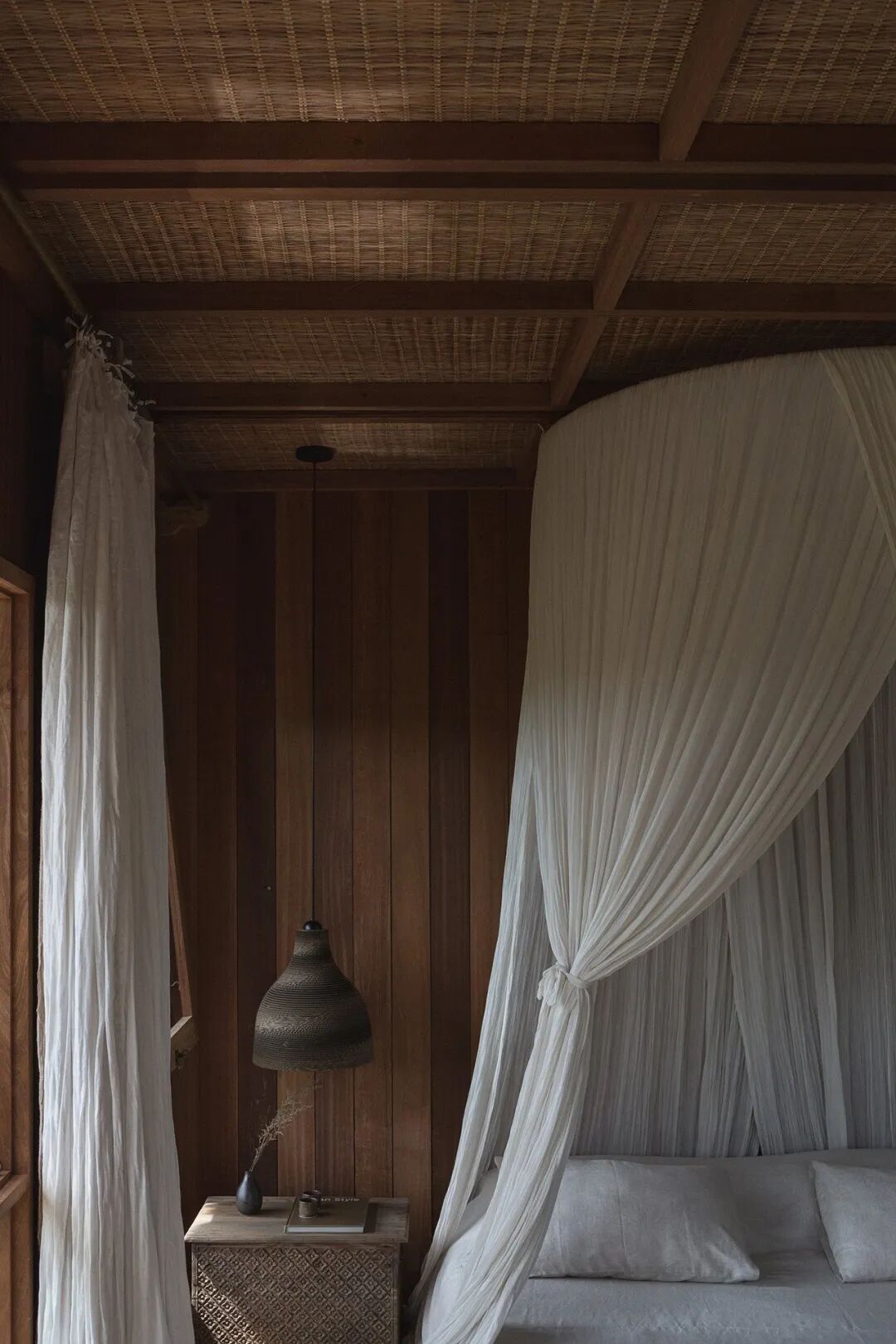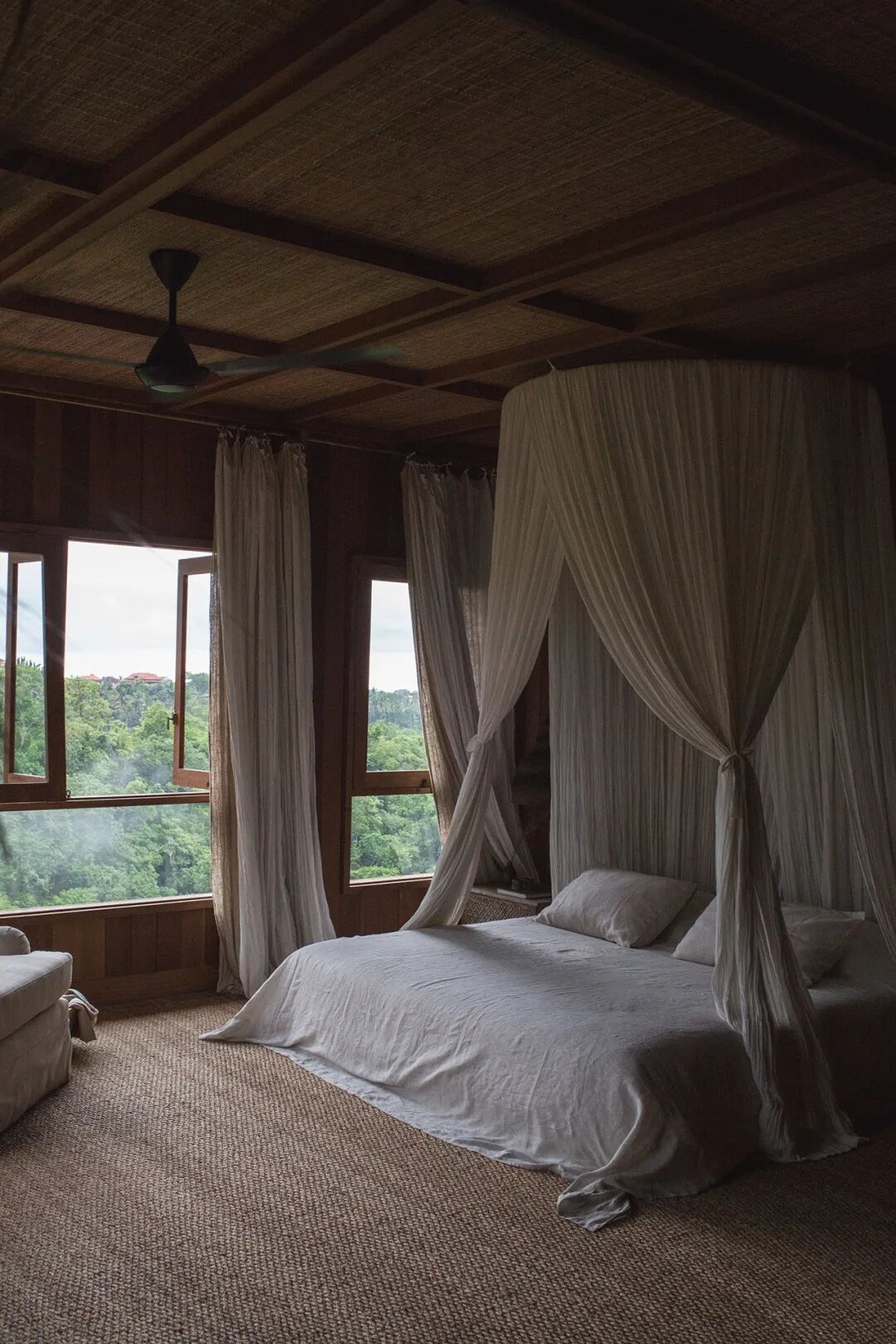 印尼硬木地板、苏门答腊岛柔软的天然地毯和蚊帐床篷为卧室营造出舒缓的氛围,并和谐地与全景窗户的青翠景色相得益彰。但是,也许房子里最好的地方是欣赏周围的自然环境并挖掘该地区的灵魂,其中两间客房中的露天淋浴,提供令人惊叹的360度全景。