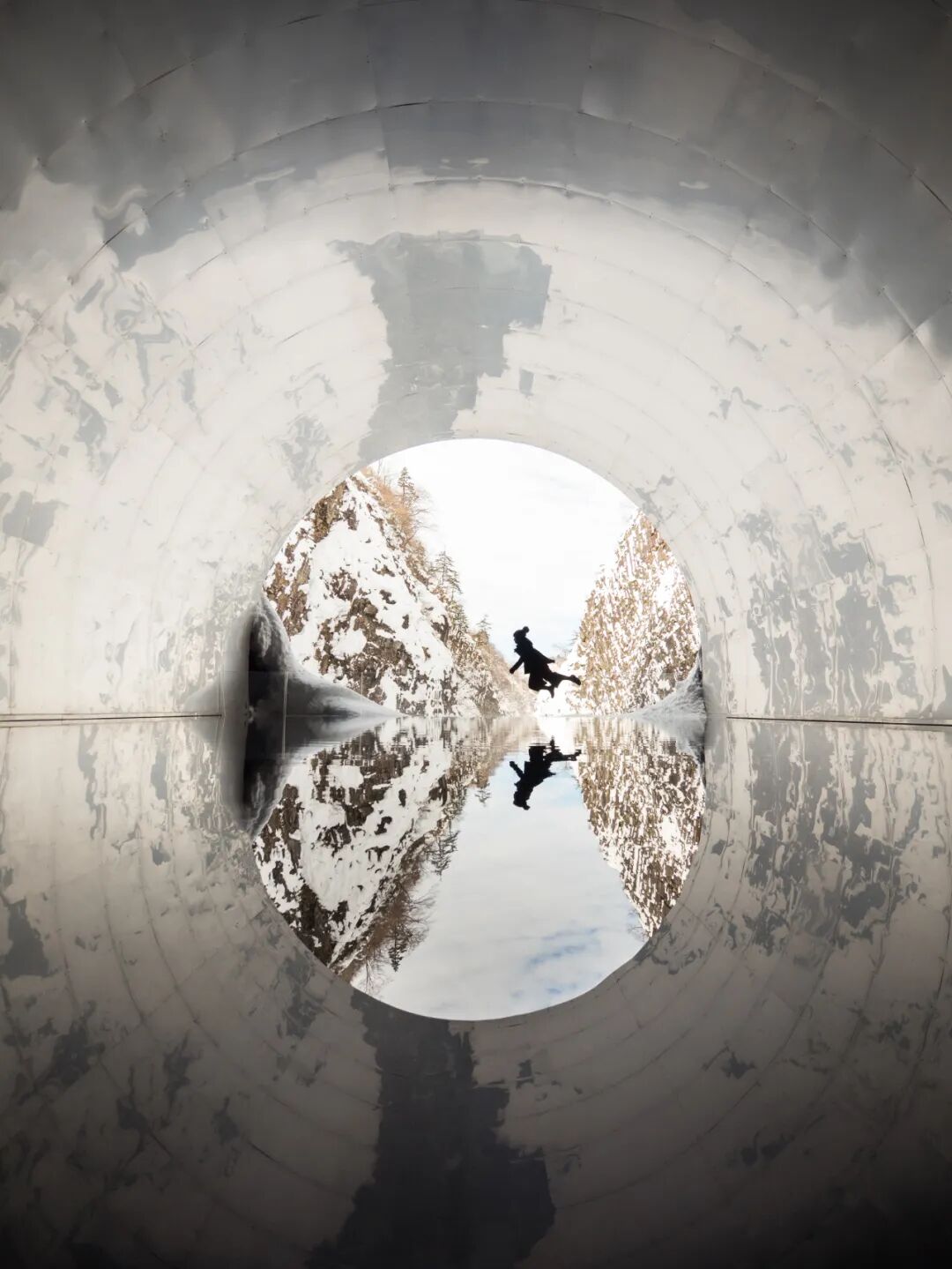 MAD将地面设计成浅浅的水盘,观景台墙壁铺设了半透明的不锈钢板将外面的山水天空反射到隧道内部。内外边界模糊,倒影和风景在水面完整的圆形中相融。