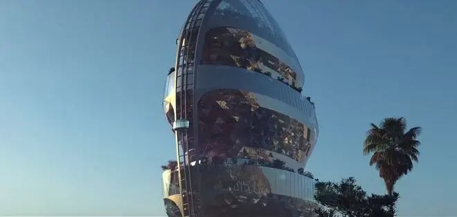 “The Star”的形态看起来像三个相互堆叠的玻璃漏斗,顶部有一个玻璃圆顶,由一个薄薄的上层结构捆绑在一起,模仿一个鸡蛋的轮廓。该空间的实际用途是作为索道的轨道,该索道将沿着建筑物的外边缘运行,并将乘客运送到封闭的屋顶餐厅、活动空间和观景台。