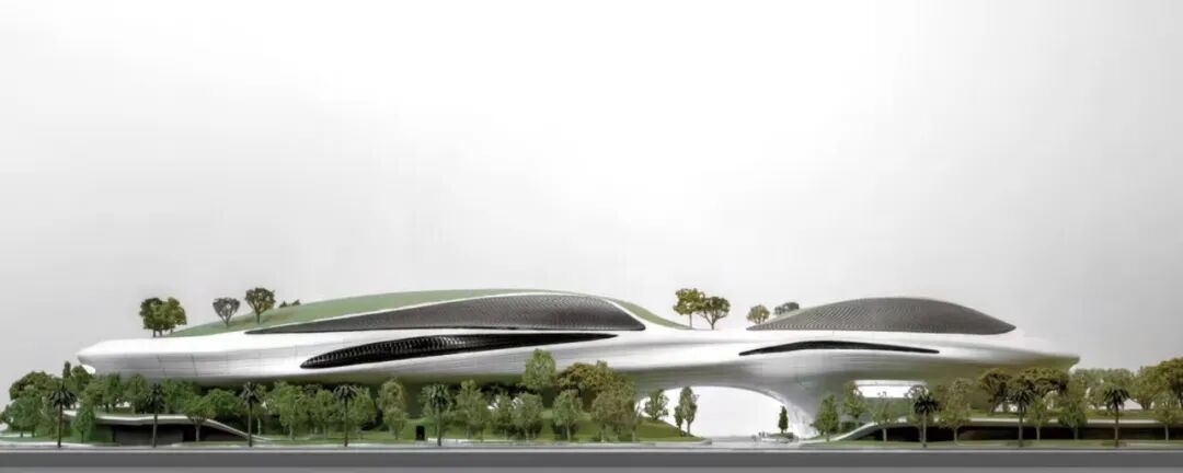 它的外立面是弯曲的玻璃纤维板,同时像高架桥一样高高地抬升,形成了绿化的广场和通往博览会公园的新通道。