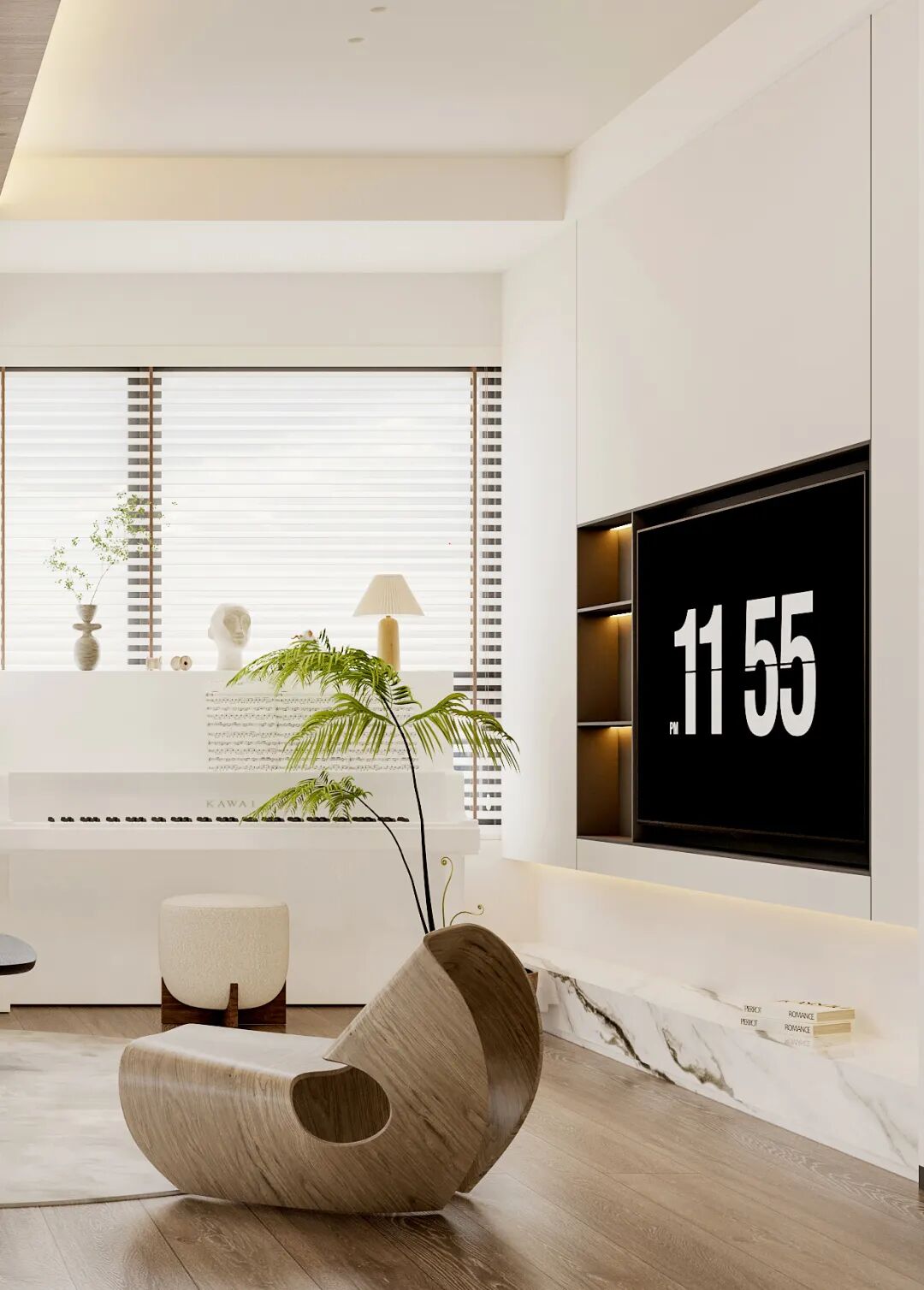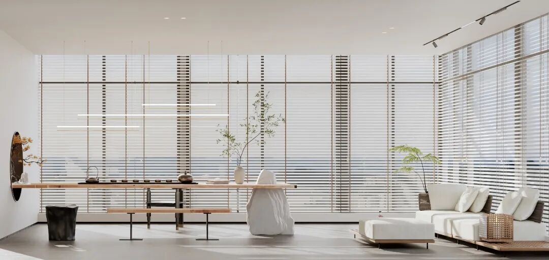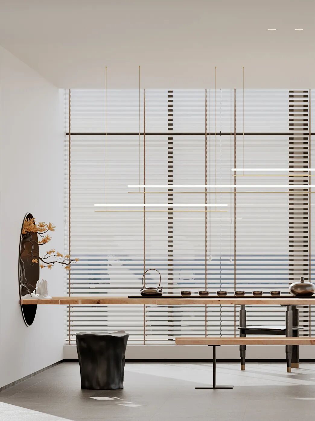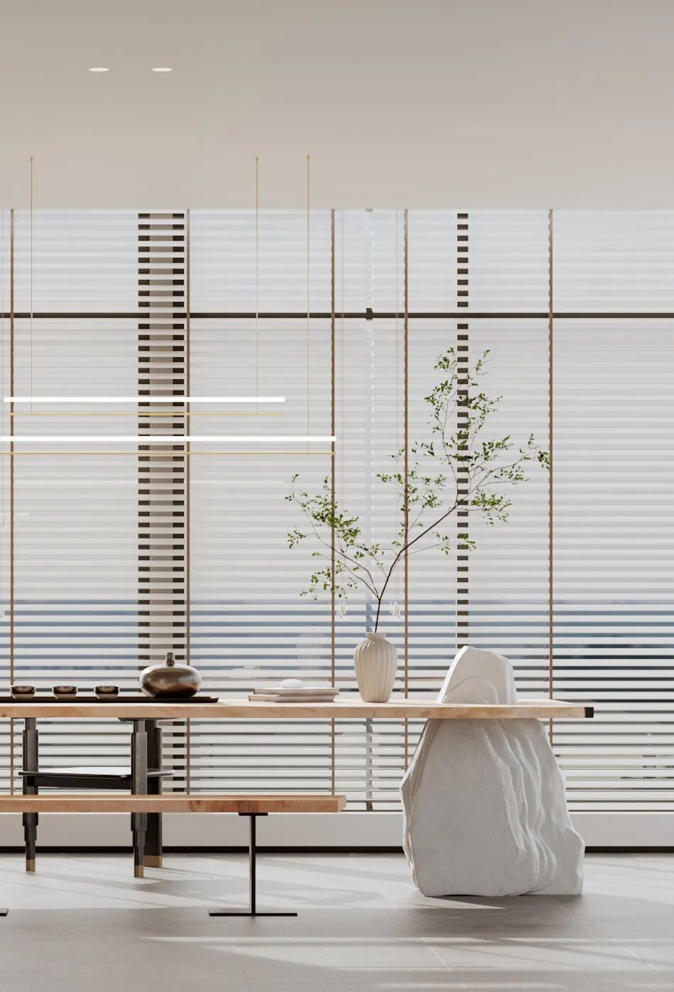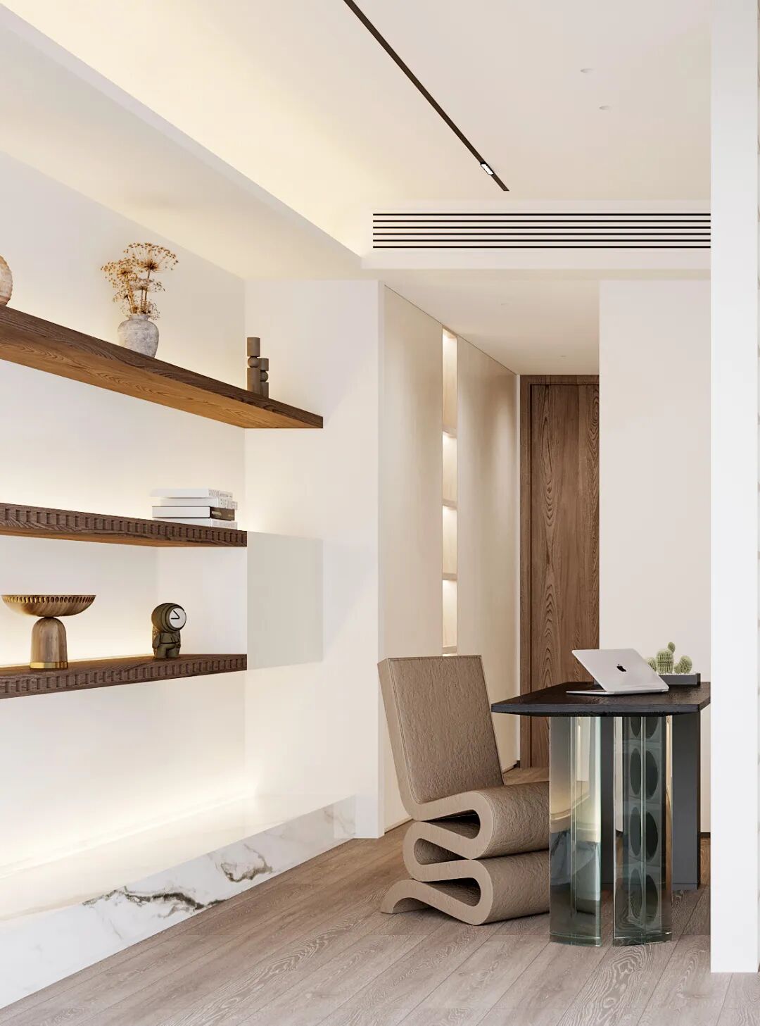 室内空间摒弃了繁多的装饰,搭配着流畅的线条带来一种现代主义的高度理性美。同时,融合了东方的意蕴,空间以现代简约的基调结合了东方的隐逸美学,使住宅在满足简单的生活需求之外,审美和艺术价值也得到了提升。