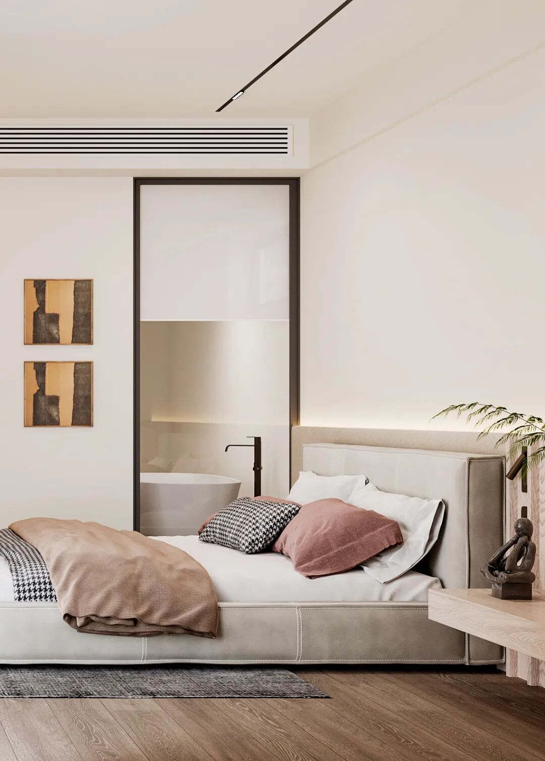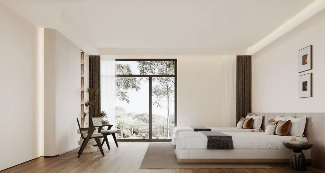 住宅内的卧室配置了大面积的落地窗,以增加室内外之间的互动性,同时允许更多的自然光进入室内。浴室与主卧空间联动,增强了空间的通透性,活跃了空间氛围。