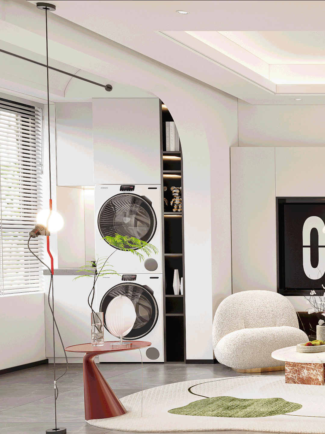 艺术萌系的边几与不规则图案的地毯,糅合温柔的颜色和柔软的材质,线条与材质在力量与柔韧之间相互对抗,用艺术语言平衡空间场域,形成一番新的秩序美感。
