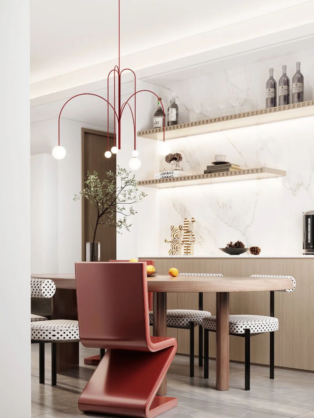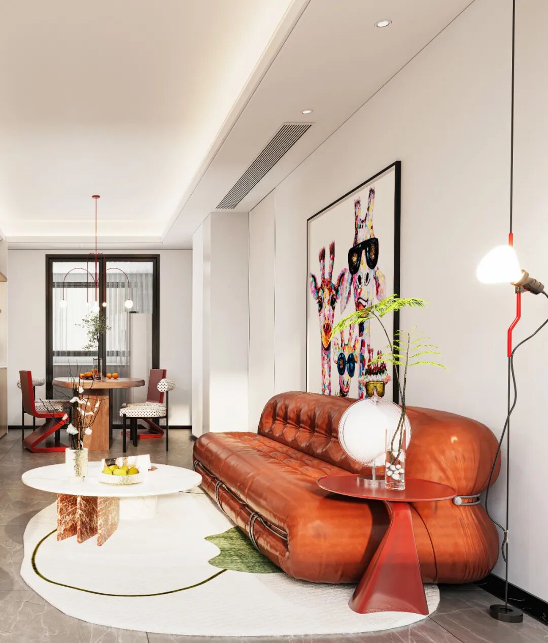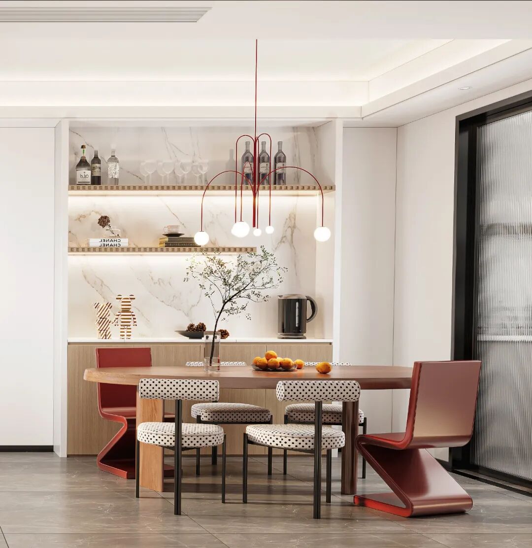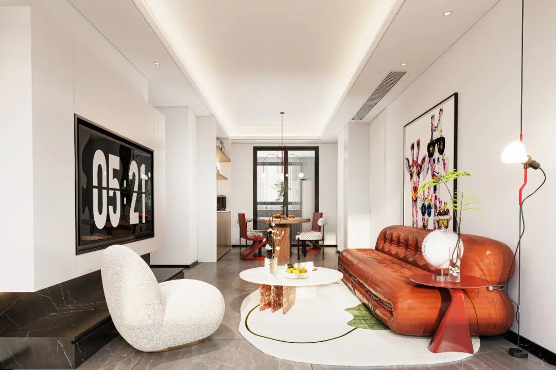 个性时髦的年轻化设计总是天马行空,艺术的沙发、不对称的装饰灯具和自由组合的餐椅,它们特立独行、时尚活跃。没有直角线条设计的茶几和摆件,带来视觉安全感,温柔、俏皮。