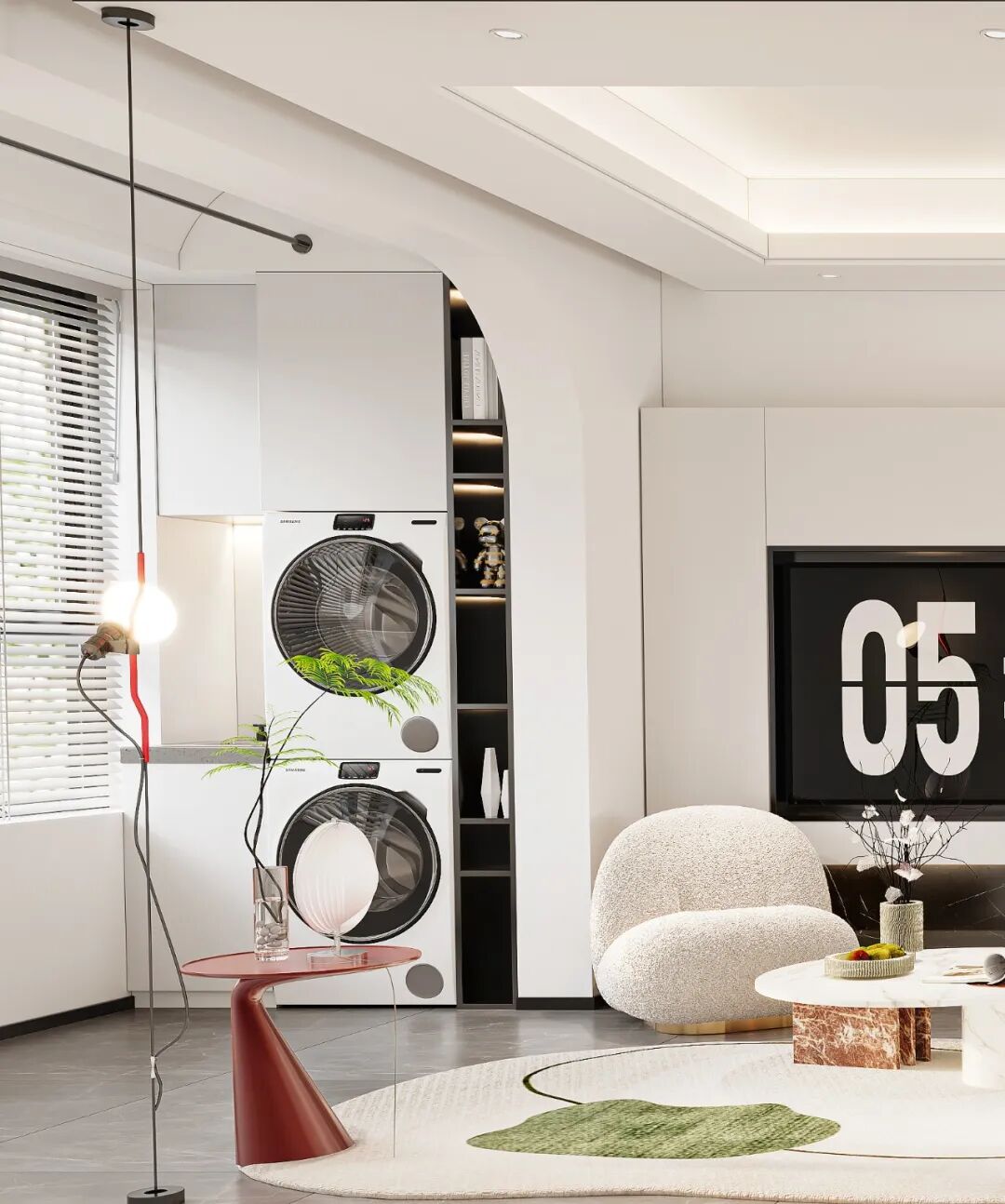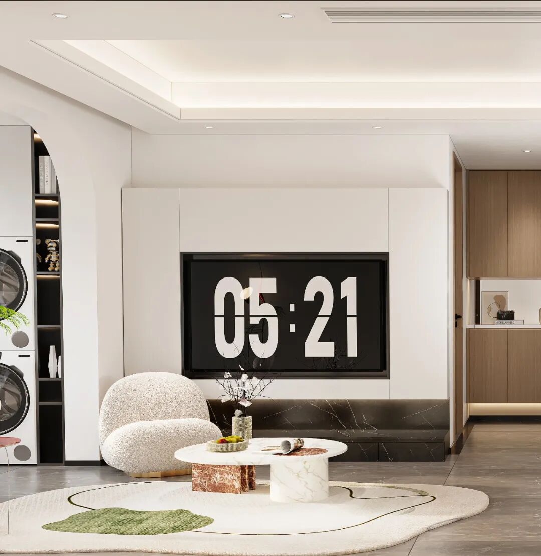 The edgewise table of artistic originality and the carpet with irregular patterns combine gentle colors and soft materials. Lines and materials confront each other in strength and flexibility, balancing the space field with artistic language, and forming a new sense of order and beauty.