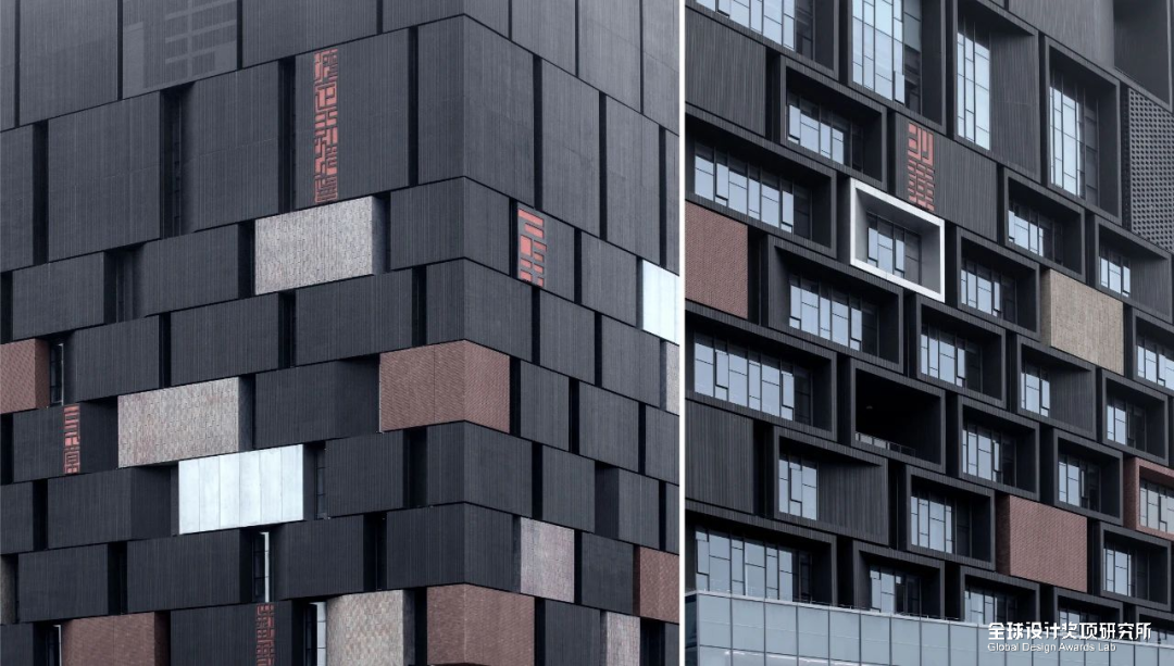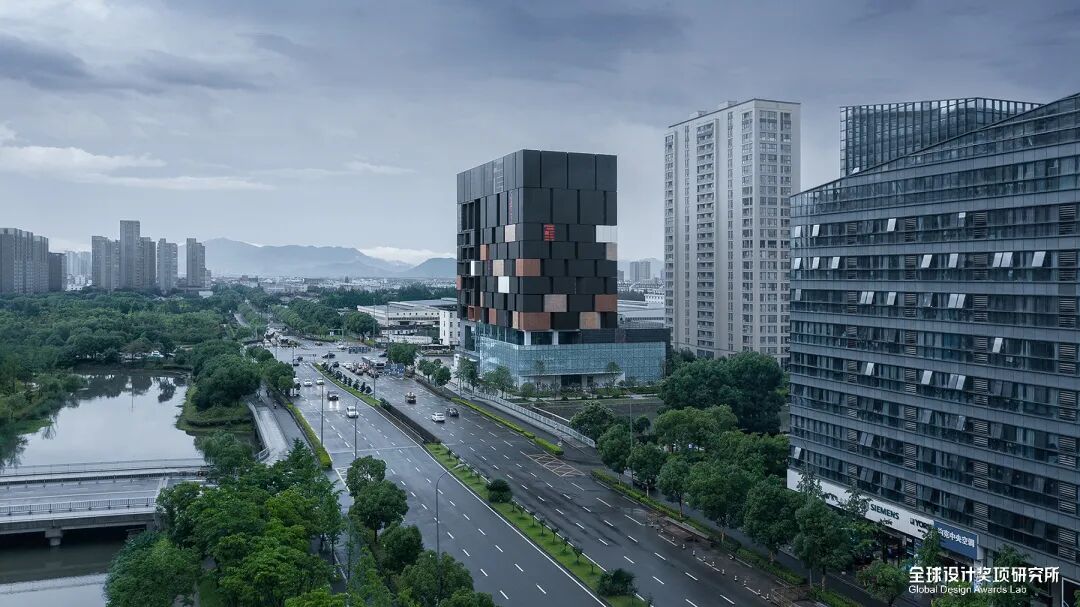 作为城市标识建筑的直观体现,社区文化中心及北侧的体育中心的塔楼外立面采用了青绿色釉陶,从杭州传统的文化瑰宝《富春山居图》中提取山水之形,形成了具有杭州文化底蕴的立面效果。