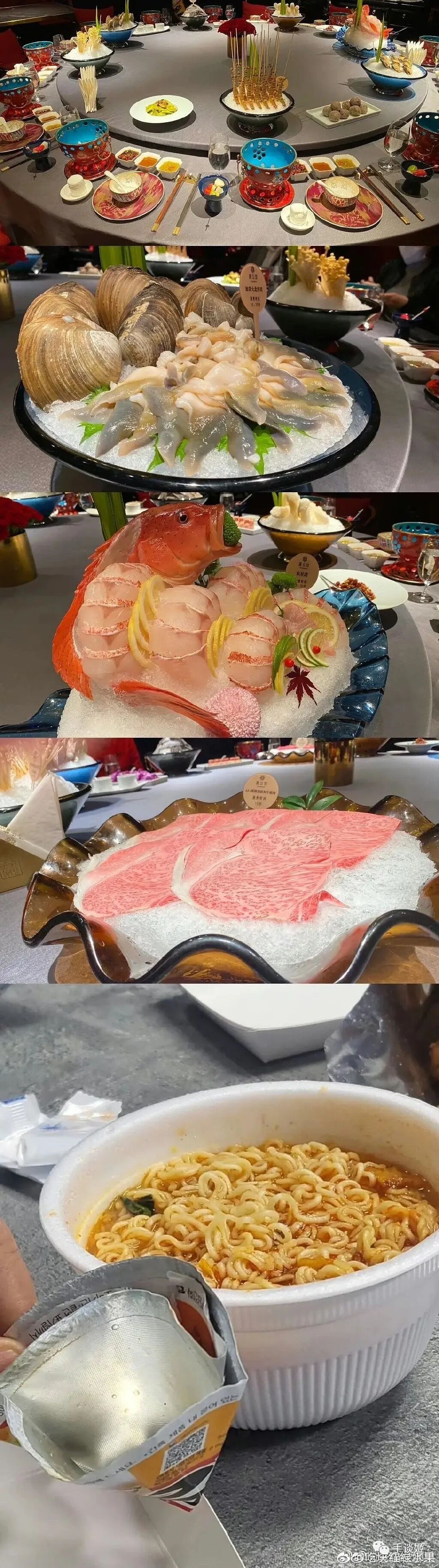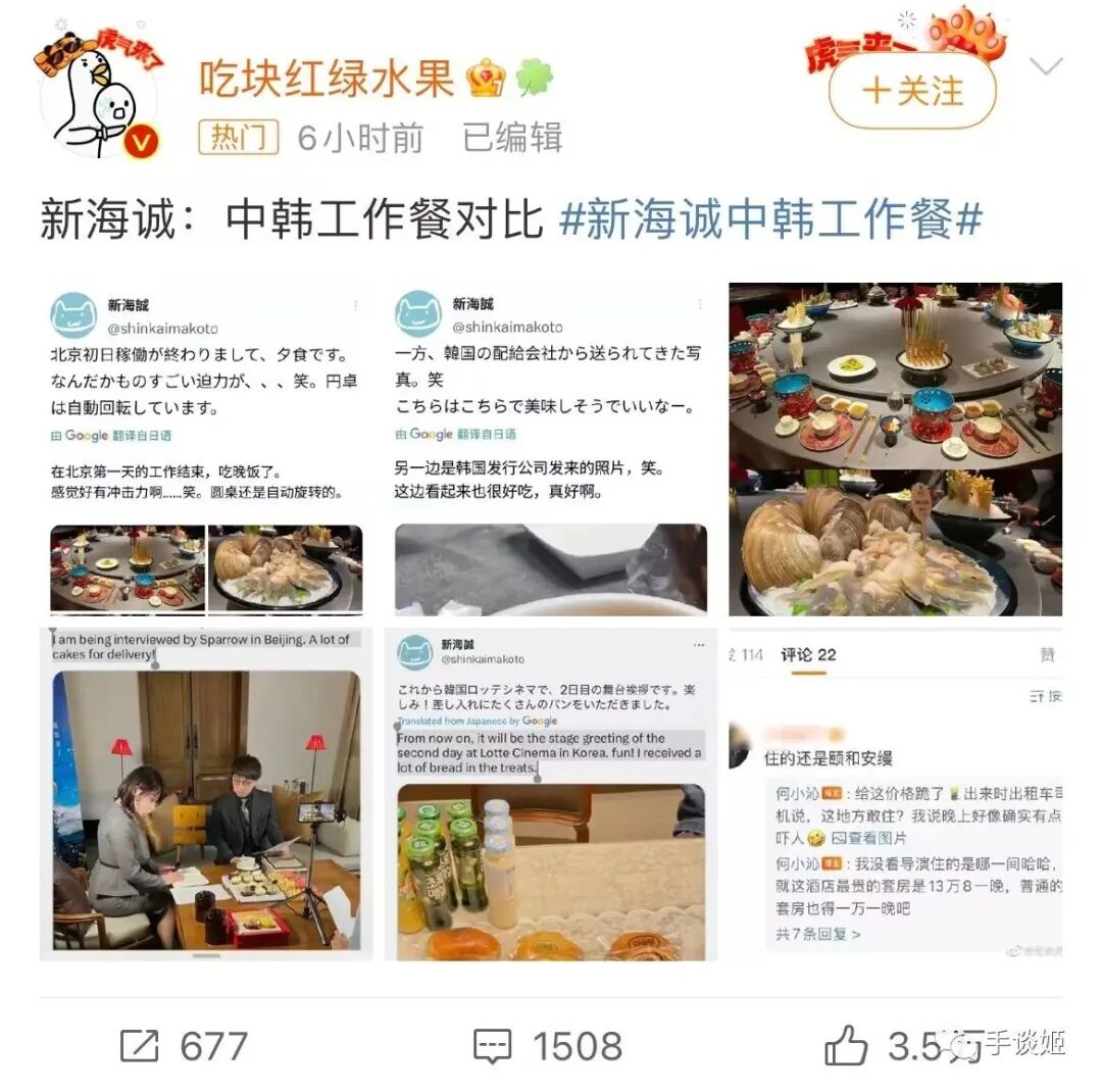 为啥吃顿饭都能引起转发呢?哦原来与此同时,新海诚把国内的美味和在韩国宣传电影时吃的食物进行了一番对比。