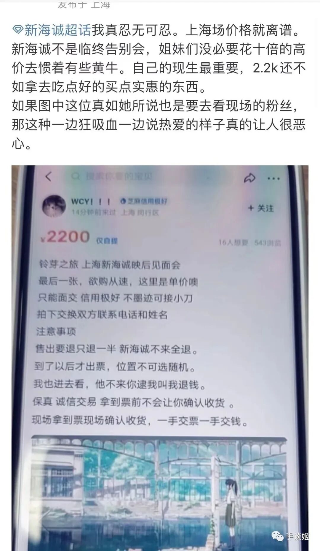 不过新海诚来国内对于观众而言也不全是愉快的事情,前几天的时候,上海的抢先票就受到了黄牛的困扰,有人在咸鱼上高价转票,让影迷很不愉快。类似的情况在电影节时也时有发生,还是物以稀为贵。