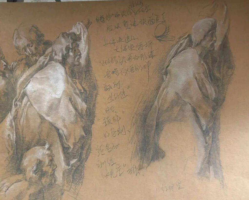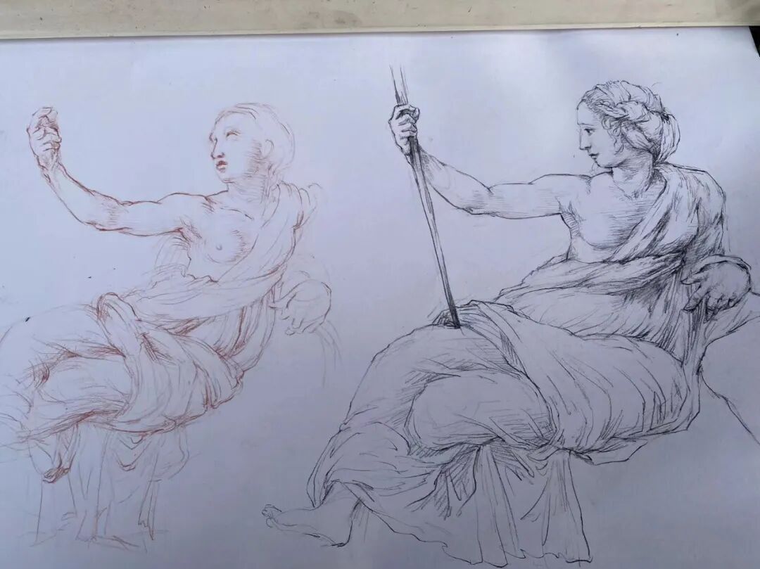 案例4:美院学生对拉斐尔素描的临摹(左)和对壁画的临摹(右),可以看到学生在左边的素描临摹中,模仿了拉斐尔素描中的线型表现手法,但在右边临摹壁画的时候,习惯性地回到了明暗调子的塑造方式中。