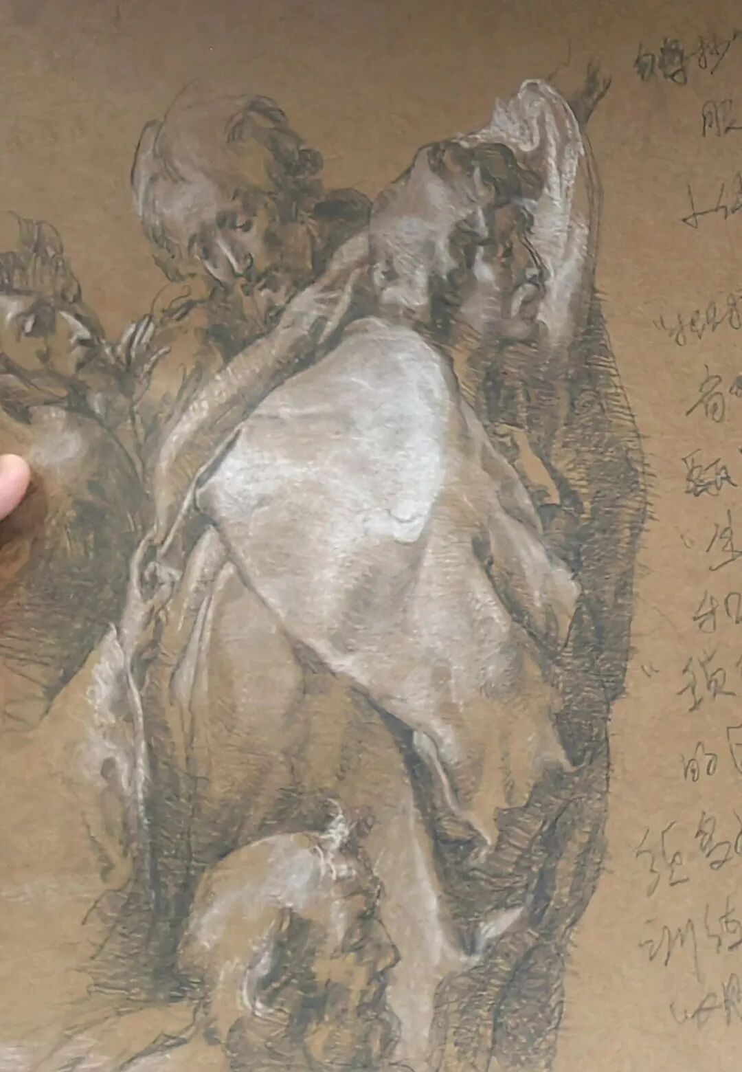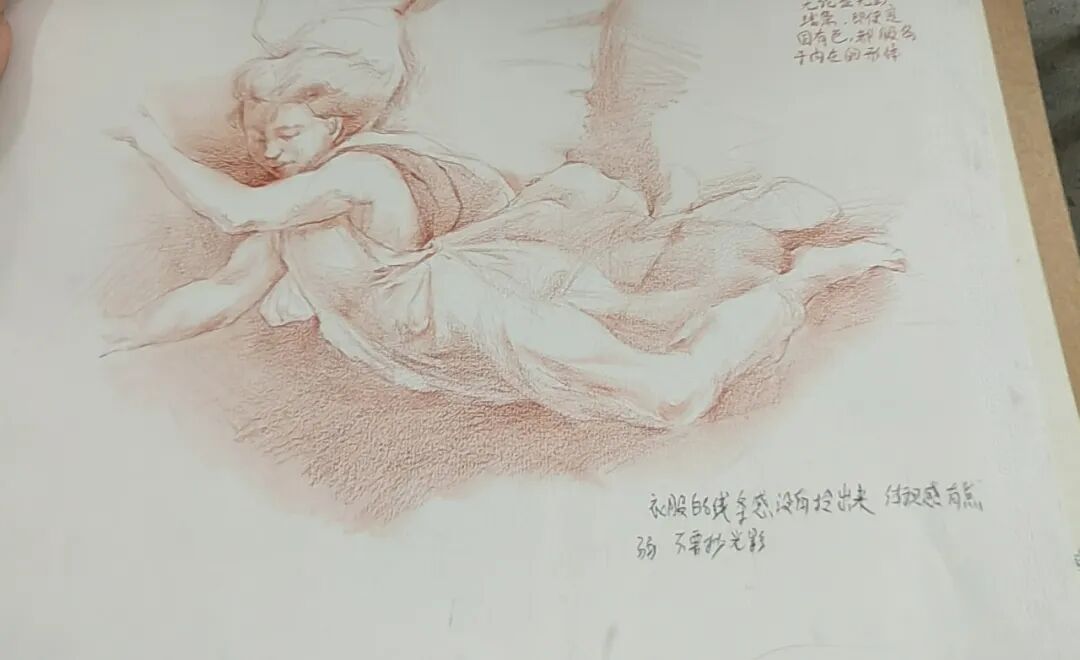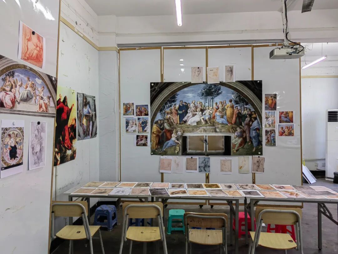 图4 美院基础部教室内,墙壁上是壁画图片,桌面上是与之相对应的素描手稿