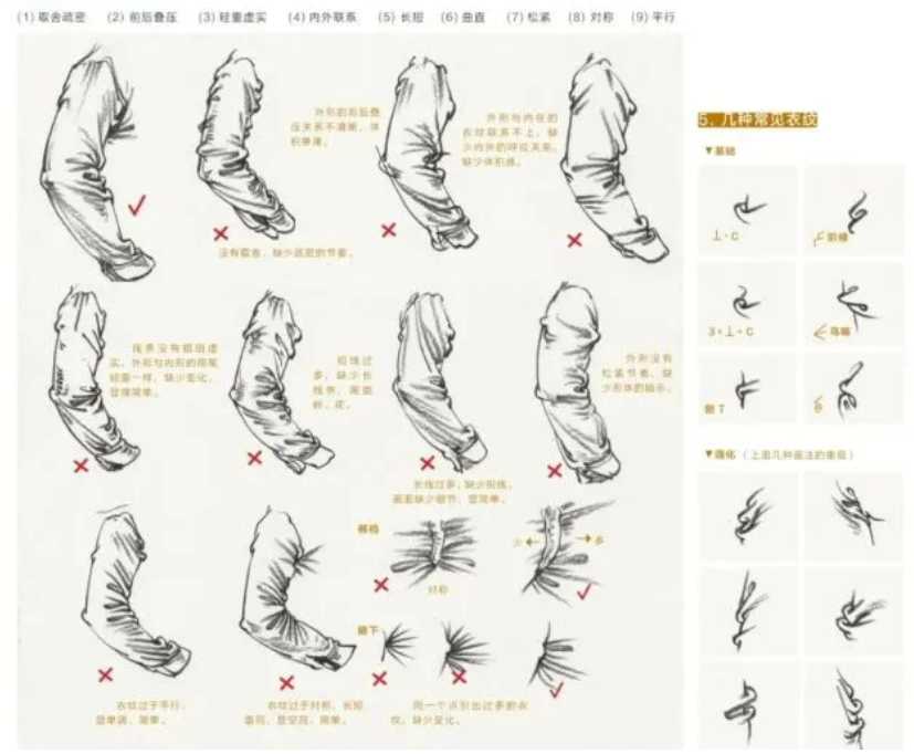 图6-7 考前速写示范中的衣褶归纳,体现出非常明显的画谱式思维