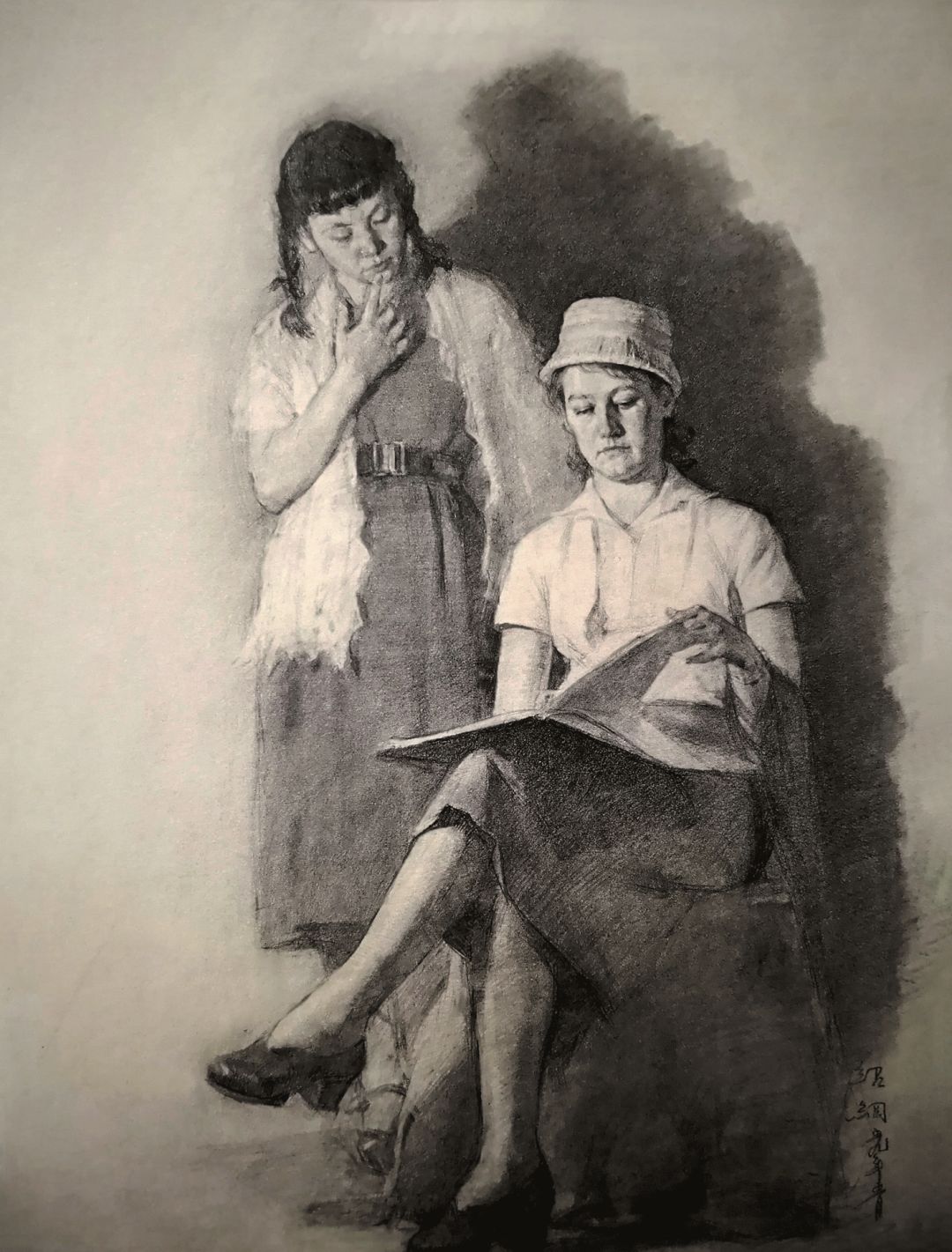 《一立、一坐的女人》炭棒画
