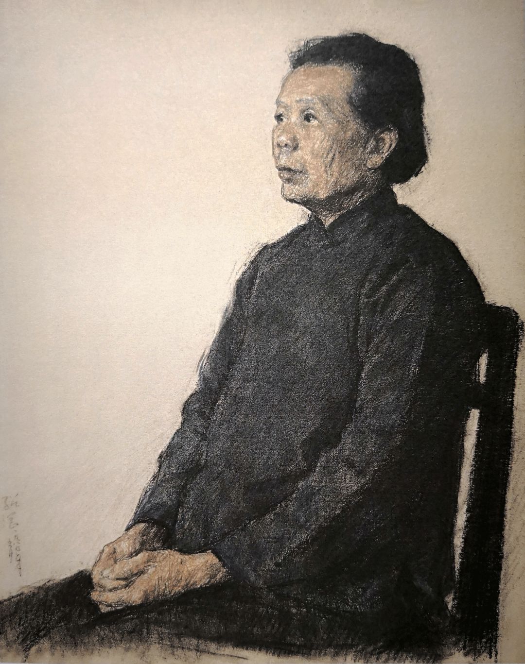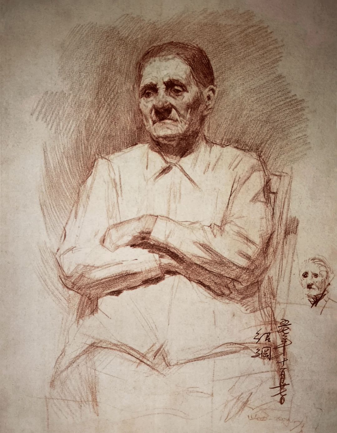 《老妇坐像》素描粉彩画