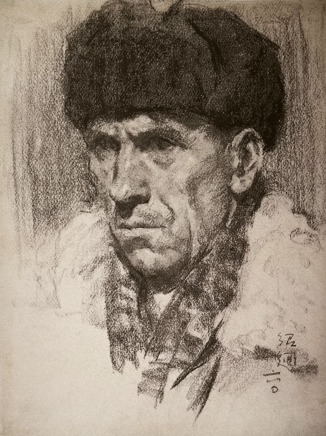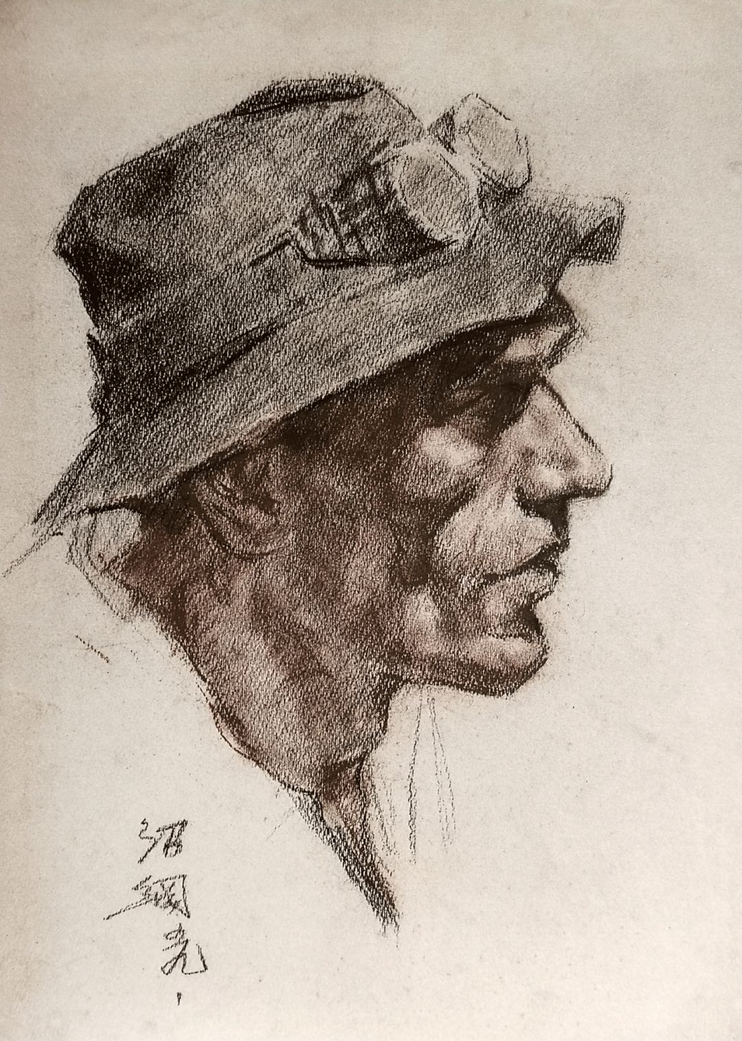 《带帽老人像》黑色炭棒画