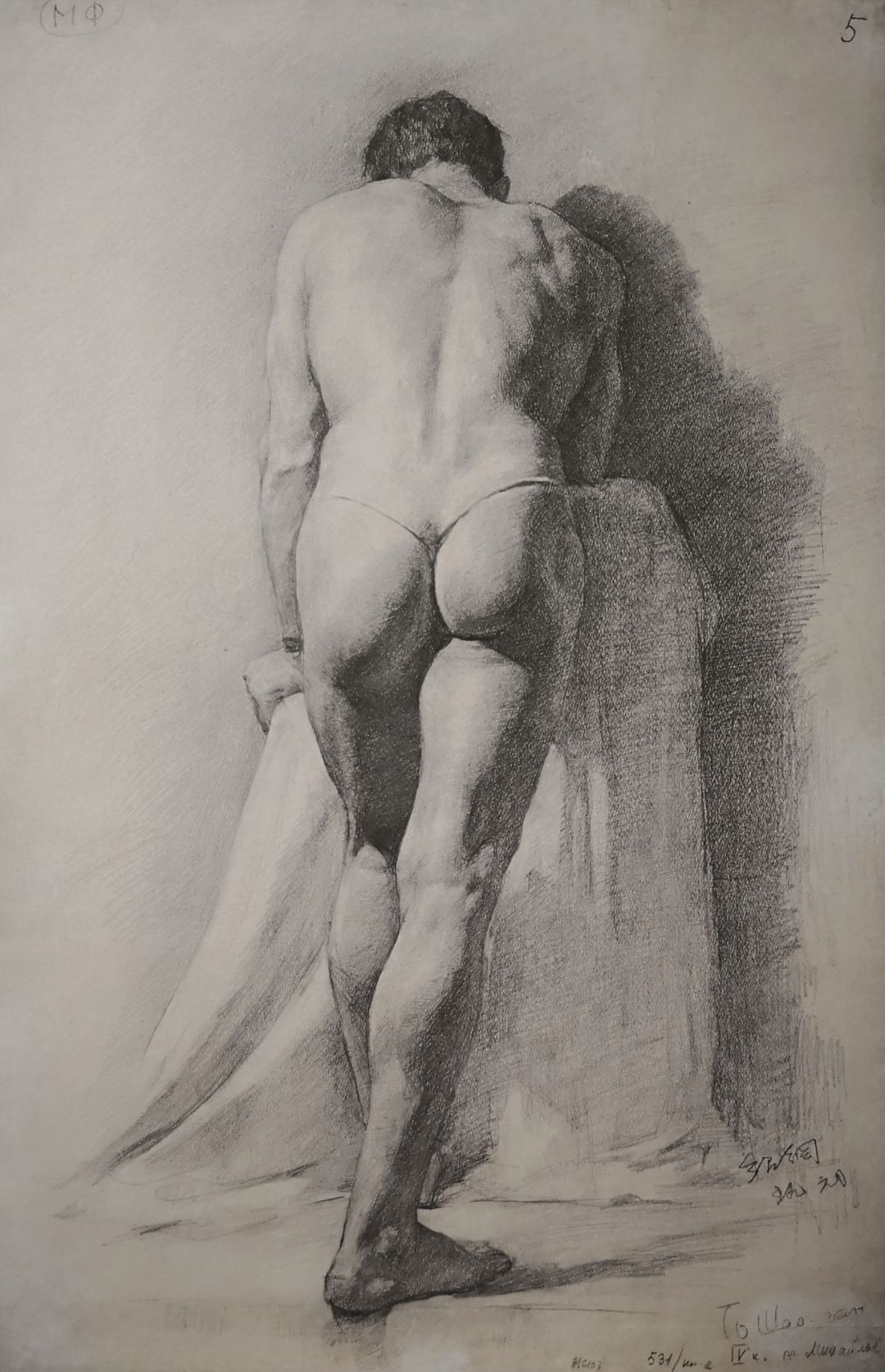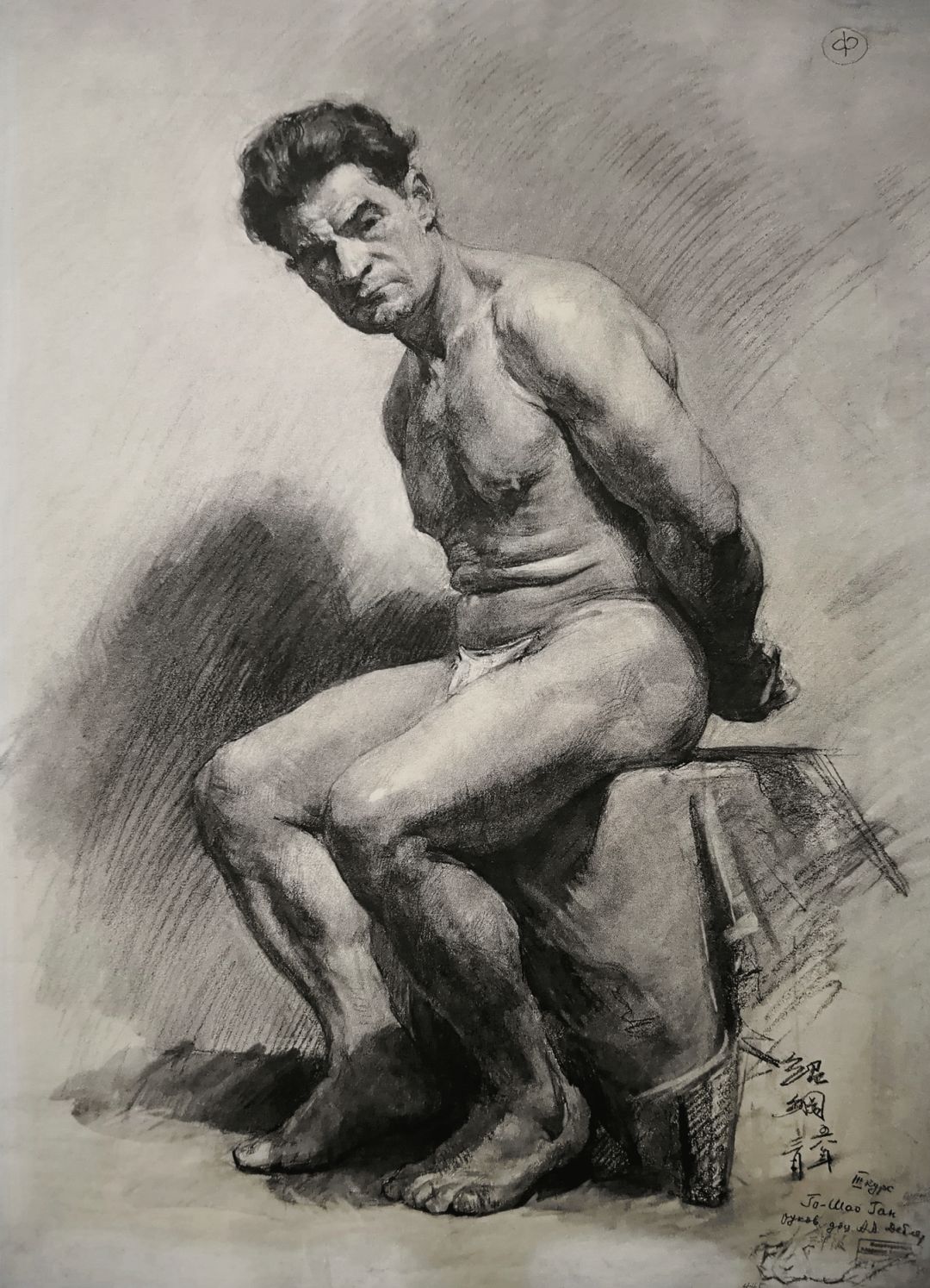 《背手而坐的男裸》木炭、水墨画