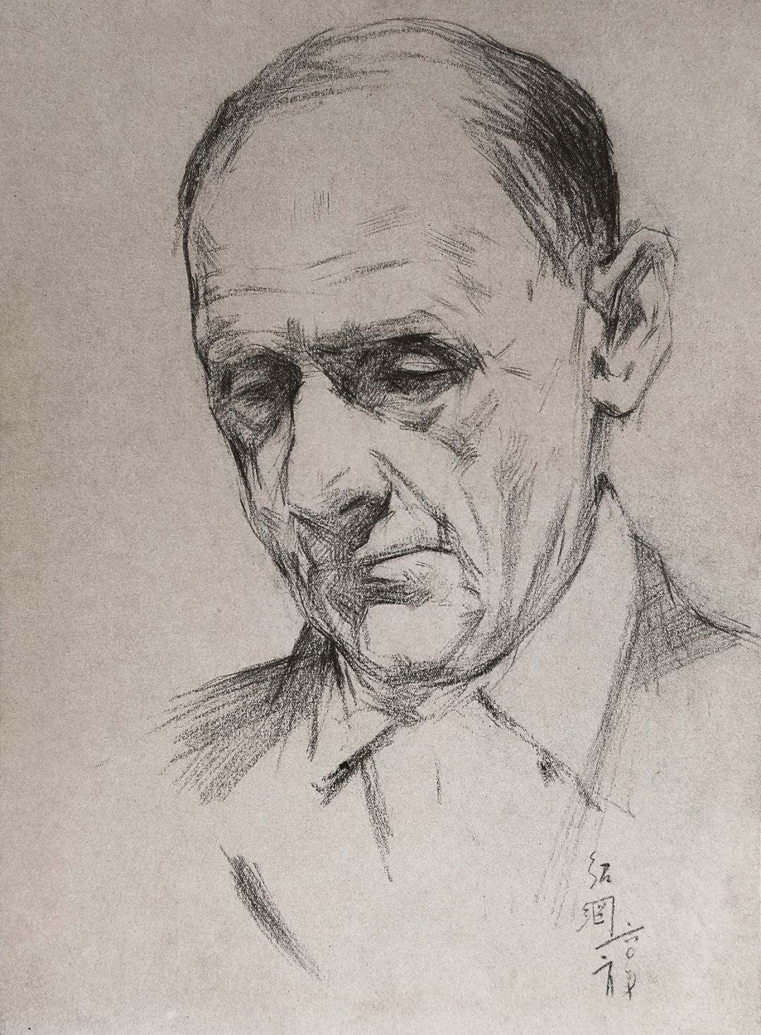 《谢顶老人像》炭棒画