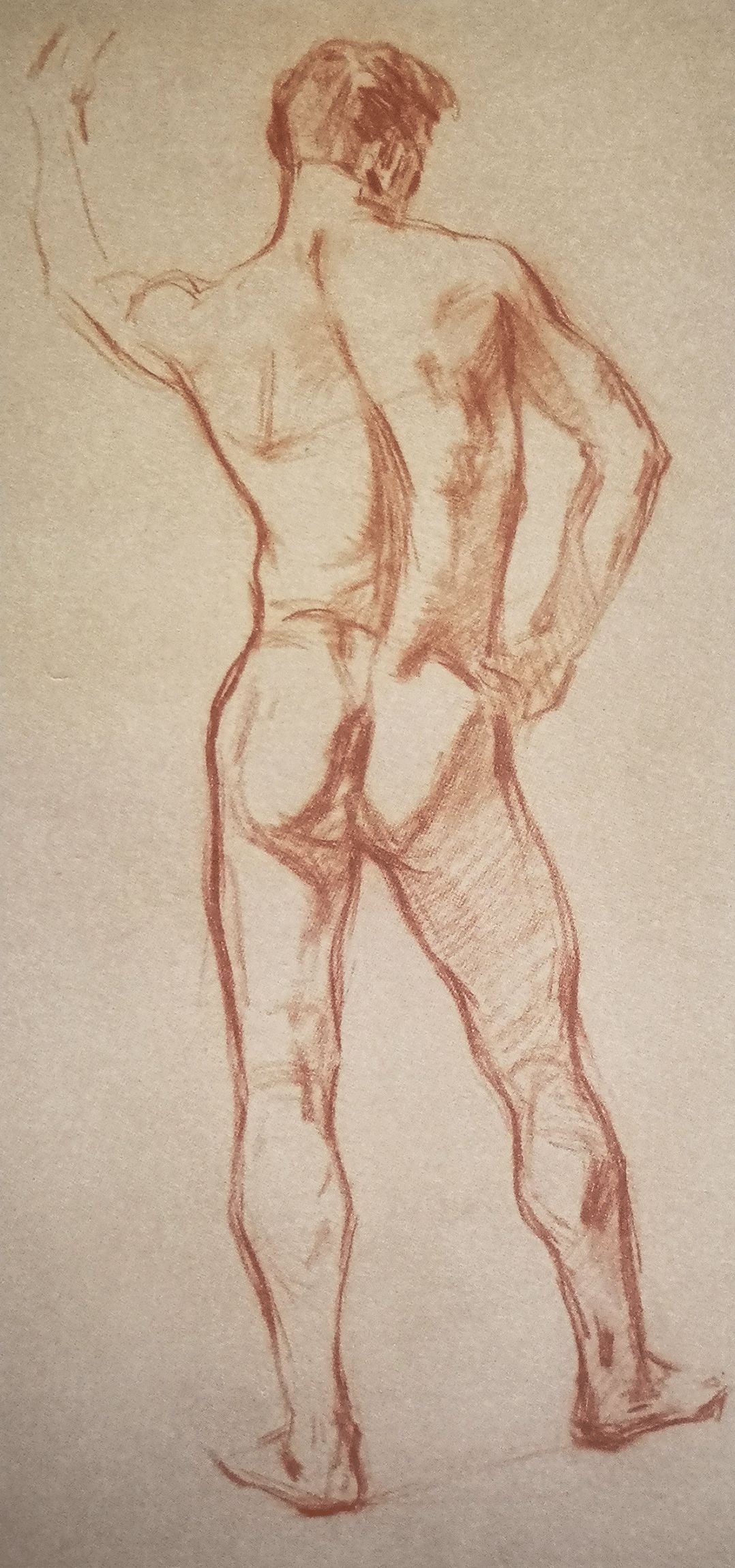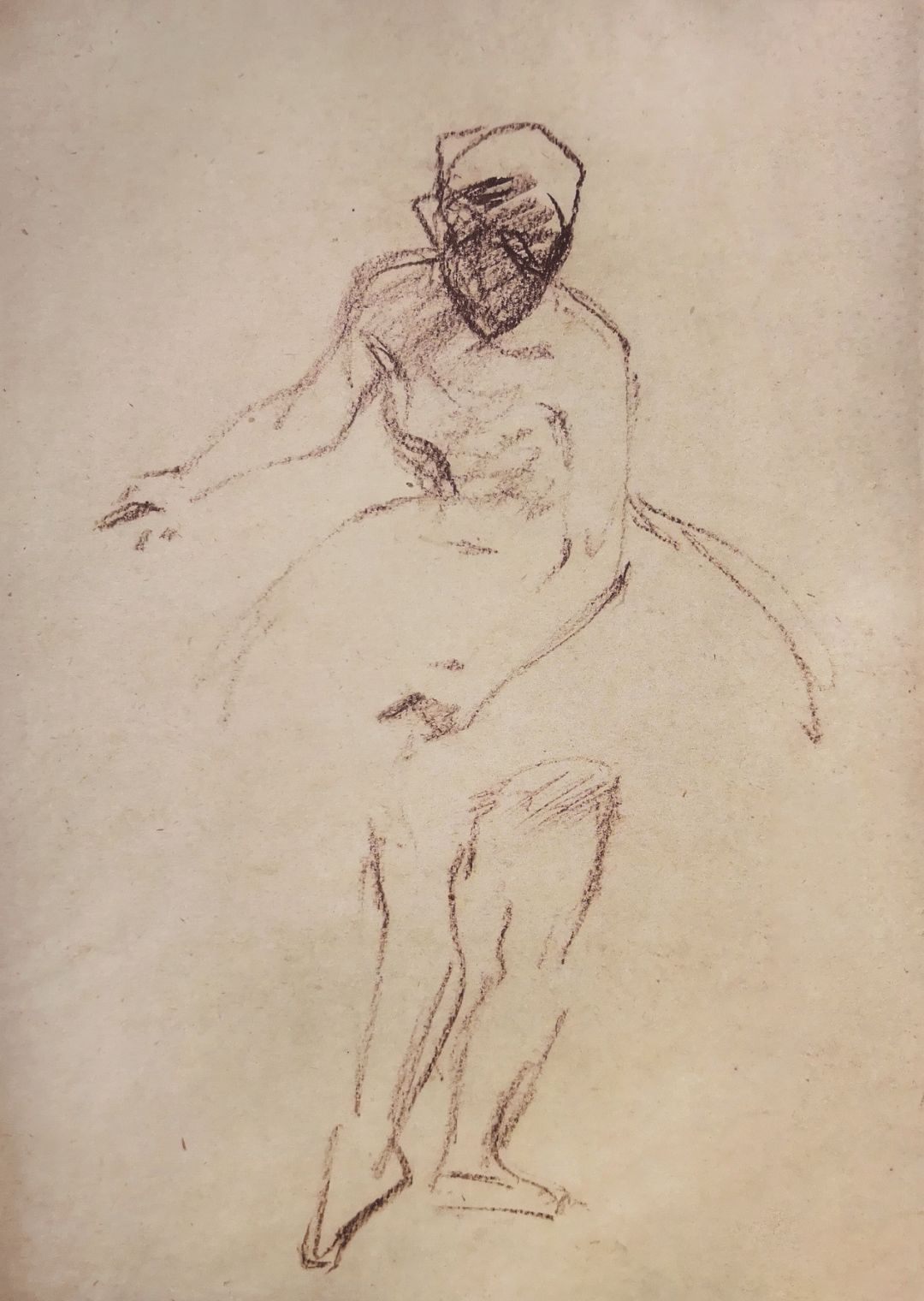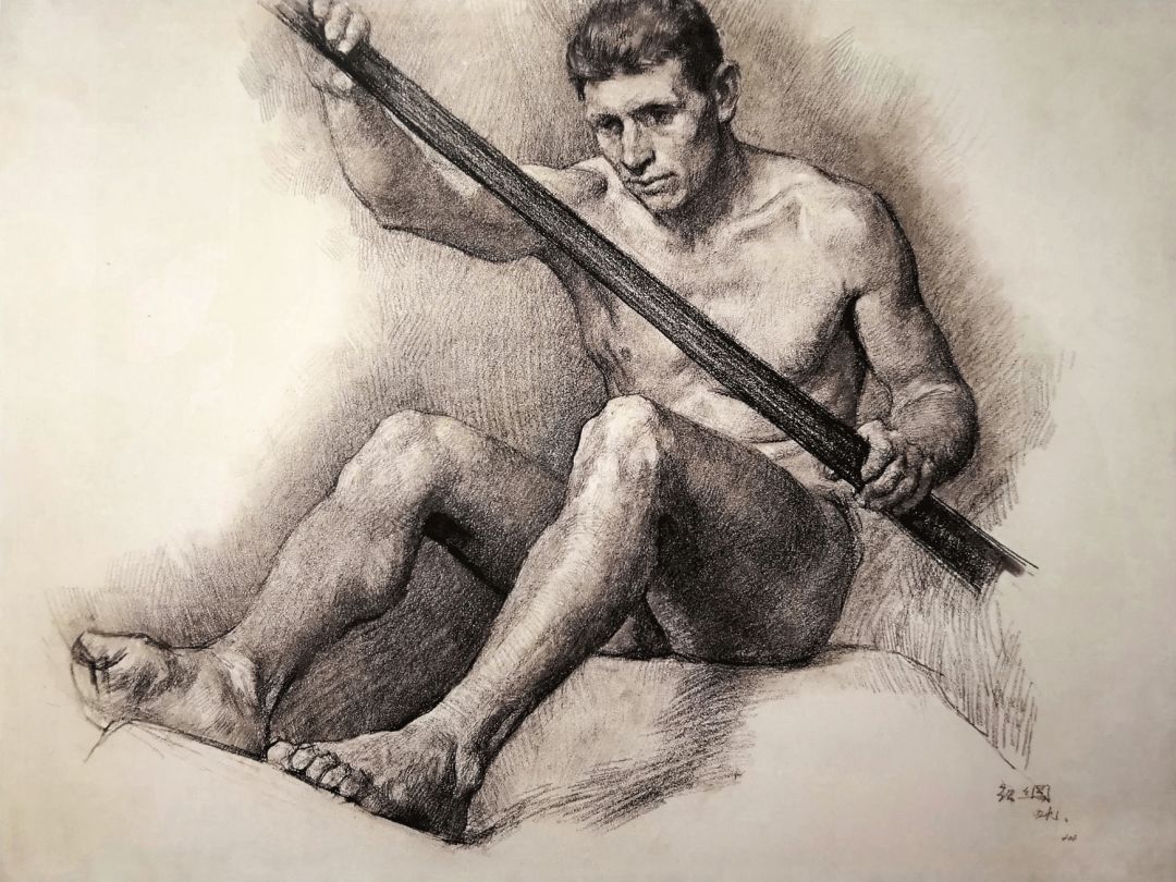 《拿船桨坐着的男全裸》褐色垩笔画