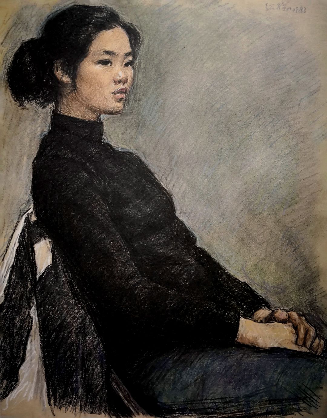 《黑衣女青年》素描粉彩画