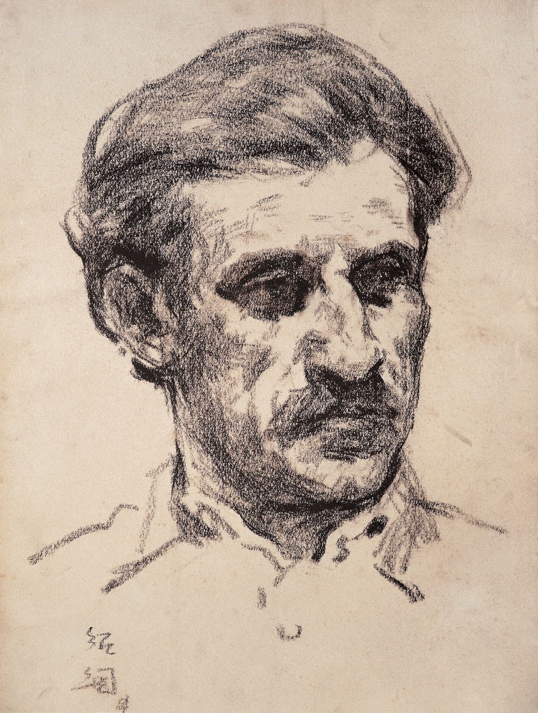 《半身老人像》褐色垩笔画