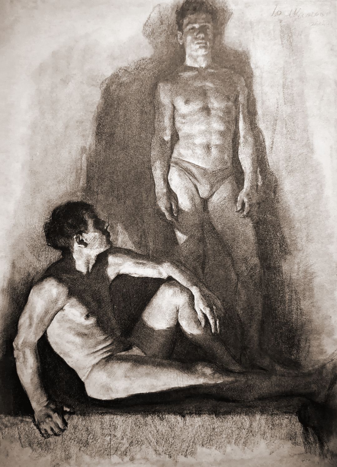 《一立、一坐的男子像》炭棒画