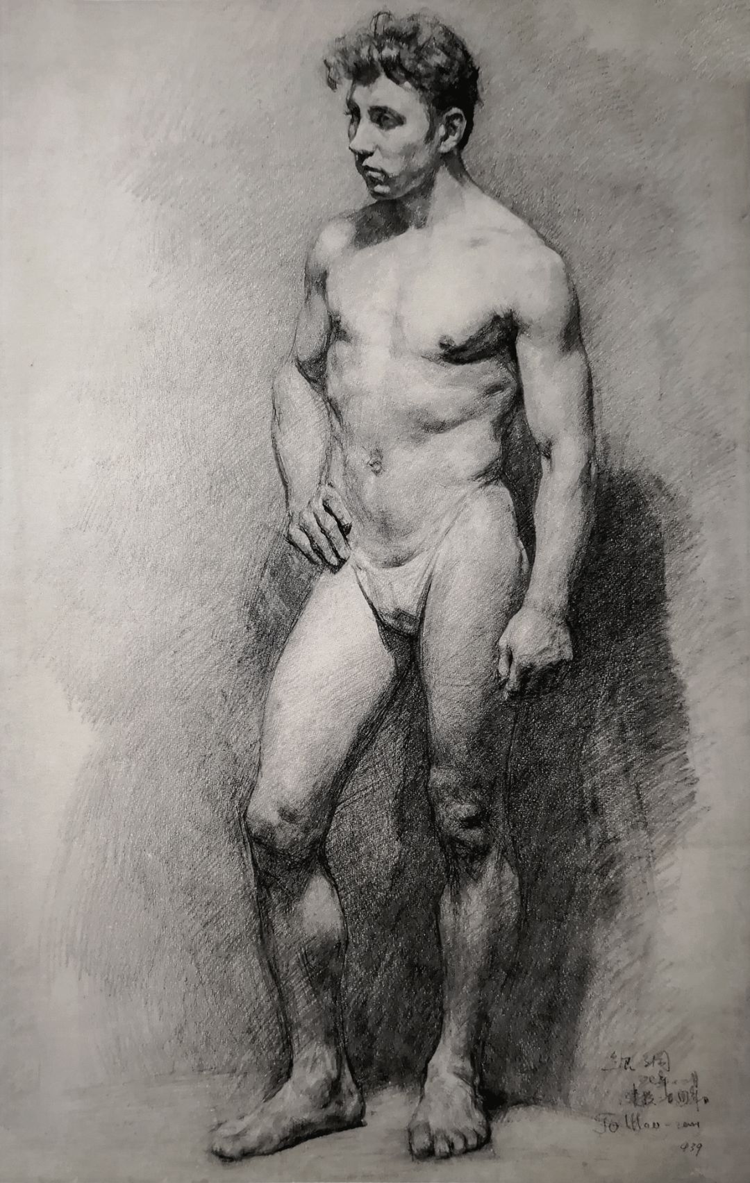 《右手叉腰站着的男裸青年》铅笔画