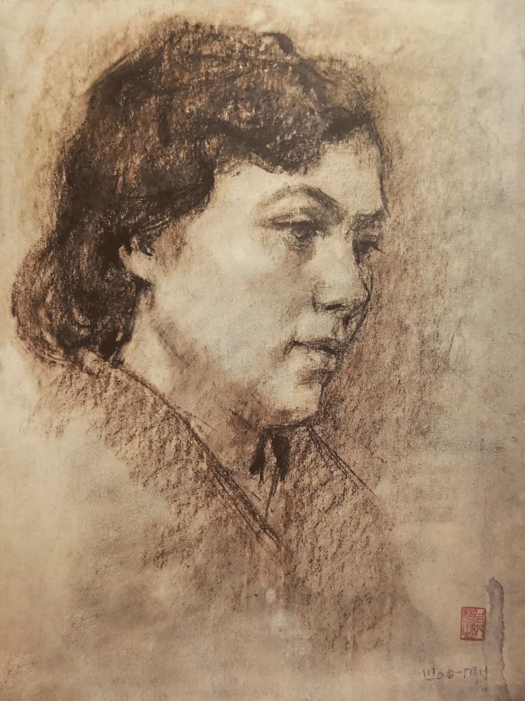 《女子头像》褐色垩笔画